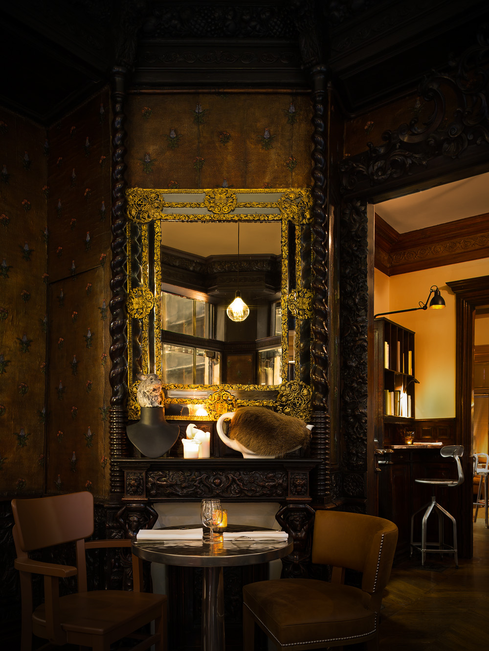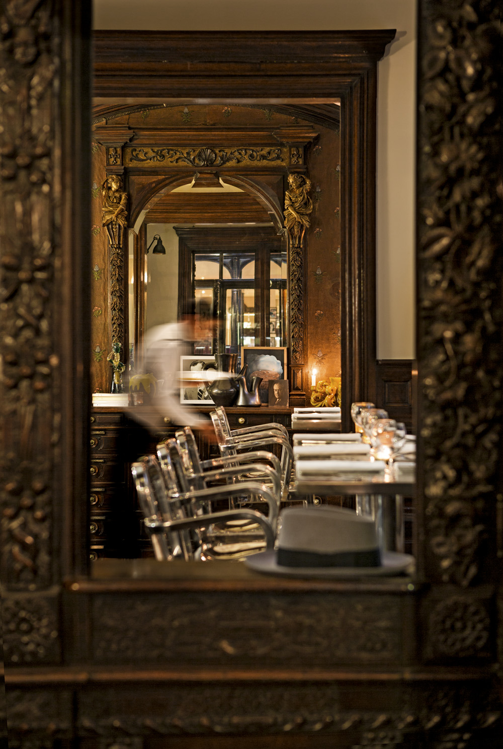 Il designer (che ha casa anche a Burano, non lontano dal Caffè Quadri sempre degli Alajmo) ha attualizzo con luci e dettagli il contesto storico dell’antico graveur, fatto di boiserie e inserti di arredo che spaziano dal XVI al XVIII secolo. Con lui ha lavorato l’architetto Averland, organizzatore del minuzioso restauro e della sistemazione del Passage de Panoramas.