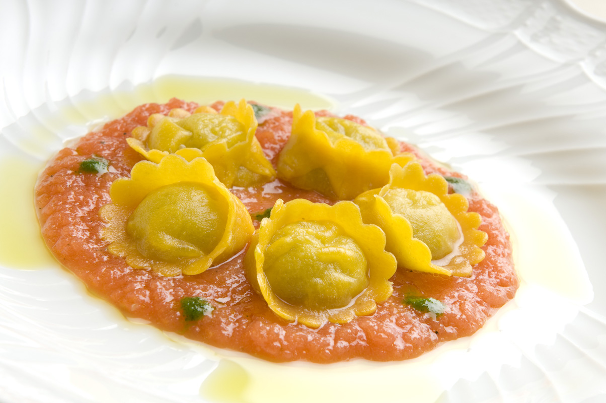 Qui una delle ricette più famose di Caino: i Ravioli di olio extravergine con colatura di alici e capperi di Pantelleria in coulis di pomodoro