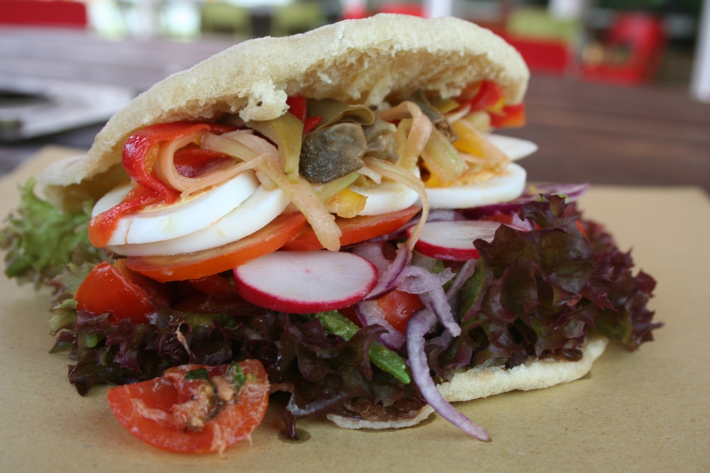 Condigiun Per un Mondiale vegetariano si procede affettando finemente la cipolla rossa. Usando il pelapatate si taglia un peperone a listarelle sottili e lo si condisce con la salsa d’acciughe. Ora si taglia il sedano e lo si unisce all’olio extra vergine. Adesso si fanno bollire per 8 minuti le uova biologiche per poi passarle sotto l’acqua fredda, sbucciarle e affettarle. Si lava dell’insalata e la si condisce con pochissimo olio. Ai pomodorini verranno aggiunti un po’ di tonno, sale e origano. Nel frattempo si sbollentano per 3 minuti i fagiolini e, quando saranno freddi, si condiscono con un cucchiaio di pesto. Si aggiungono qualche fetta di pomodoro e rapanello e si farcisce la pagnotta (o pane arabo) con le verdure aggiungendo ogni tanto una macinata di pepe fresco e irrorando con l’aceto.