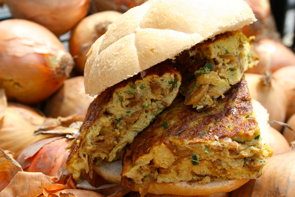 Panino con la frittata Si tagliano a fette sottili quattro cipolle grandi e le si fanno stufare con pochissimo olio extra vergine d’oliva, fino a farle quasi caramellare in circa 30 minuti. Si sbattono (poco) 10 uova intere biologiche con il sale, il prezzemolo e il formaggio. All’impasto vanno aggiunte le cipolle stufate. Adesso si tuffa tutto in una padella da frittata, alta almeno 5 centimetri. Il segreto sta nello strapazzare un poco le uova per poi lasciarle compattare. Quando, muovendo la padella, la frittata sembra staccarsi, è il momento di girarla. Aspettare che si raffreddi (temperatura ambiente) prima di tagliare a trancini nel panino.