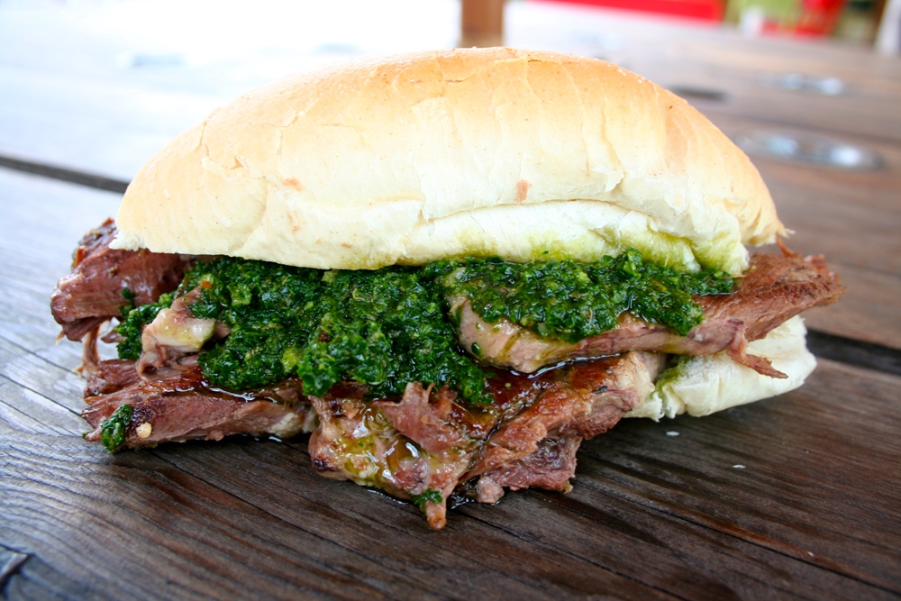 Calcio d’inizio – Panino con la lingua arrosto e salsa verde Si arrostisce la lingua di manzo intera per circa 2 ore e mezza. Privata della pelle, si taglia a fette di mezzo centimetro e la si irrora con il sugo di cottura. Il pane va scaldato molto bene disponendo le fette di lingua, il sugo e la salsa verde a volontà. La salsa si ottiene frullando tre tazze piene di prezzemolo, ¼ di peperone rosso o giallo, una acciuga sott’olio, tre spicchi d’aglio, un pochino di mollica di pane, olio extra vergine, 4 cucchiai di aceto, sale e pepe.