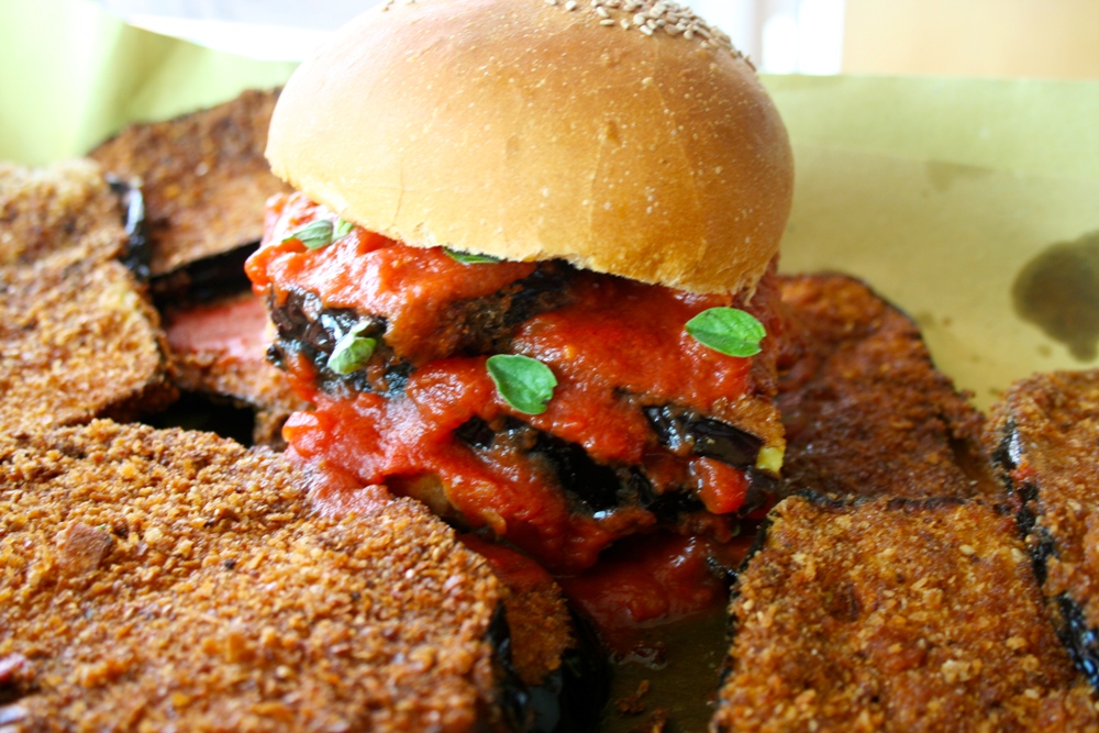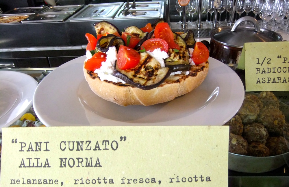 La semifinale – Focaccina con la parmigiana “ortodossa” Si cuoce il pomodoro con un poco di olio extra vergine d’oliva e uno spicchio d’aglio, che poi verrà rimosso. Adesso si tagliano a fette di circa 5 centimetri le melanzane che saranno impanate e fritte. Attenzione a non farle bruciare, altrimenti si dovrà ricominciare d’accapo. Ora si dispongono le fette alternandole alla salsa e a una spolverata di parmigiano a cui si aggiungono anche delle erbe aromatiche, come timo, maggiorana, menta… Quello che passa la dispensa. Un po’ come faceva la nonna. Per la cottura si porta il forno a 180° C per 50 minuti. Solo quando la Parmigiana sarà a temperatura potrà essere tagliata e servita nel panino.Pani cunzatu alla Norma Si affetta una melanzana grande e la si griglia su una piastra. Ora la si condisce con dell’olio extra vergine d’oliva e maggiorana. Poi si taglia a pezzetti del pomodoro e lo si unisce al sale, olio e basilico. Si mette in forno a croccare una base della pagnotta, meglio se di grano duro. Adesso la si farcisce con le melanzane, i pomodorini, la ricotta fresca e si ultima il tutto con una spolverata di ricotta dura, pepe macinato fresco e olio.