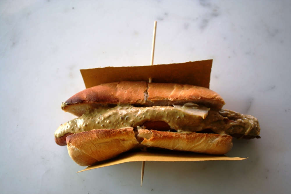 Panino con la salamella e il Salmoriglio Cuocere sulla piastra la salamella e nel frattempo preparare il salmoriglio con un bicchiere di aceto, foglie di salvia, alloro, timo, origano, basilico, menta, prezzemolo, 2 spicchi di aglio schiacciati, mezzo bicchiere di vino e un po’ di pepe. Quando la salamella è pronta va messa nel pane caldo e croccante e irrorata con il salmoriglio, che sarà meglio aver preparato un giorno prima e lasciato una notte in frigo a riposare.