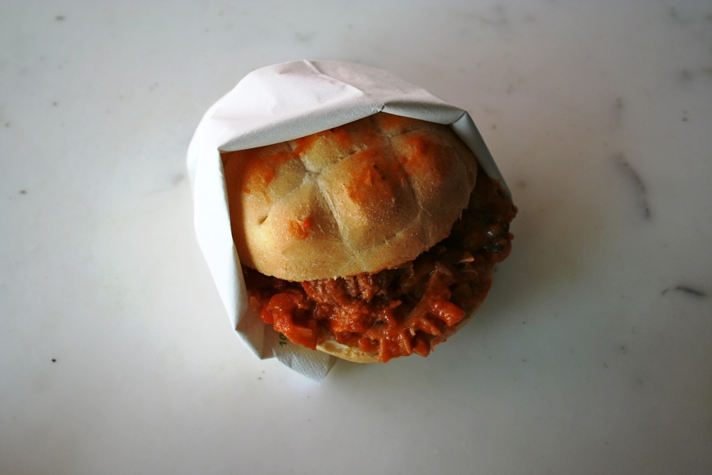 La finale – Panino con la polpetta Per fare la polpetta occorrono almeno 4 michette di pane raffermo che deve essere ammollato nell’acqua qualche ora prima. Al pane, che deve restare ben visibile, si aggiungono mezzo chilo di carne trita di manzo, 100 grammi di prezzemolo tritato e due spicchi d’aglio schiacciati, il sale e un uovo intero. Mi raccomando: il pane va grattugiato a mano molto grossolanamente per poi passarci sopra la polpetta che, una volta impastata con gli altri ingredienti, sarà disposta su una teglia oliata. Per concludere, si mette tutto in forno a 200 gradi girando la polpetta ogni 10 minuti per parte.