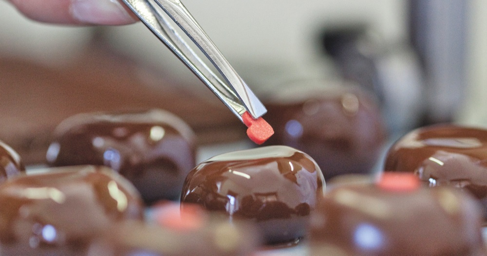 «È la selezione degli ingredienti la parte fondamentale del nostro lavoro: noi usiamo quasi esclusivamente miscele e non cacao monorigine. Per ottenere il fondente, per esempio, scegliamo pasta e burro di cacao provenienti da Venezuela e Caraibi. Poi aggiungiamo altri ingredienti come le spezie, il caffè (che tostiamo in laboratorio) o il rosmarino, che aggiungiamo fresco, la frutta in guscio (nocciole Igp del Piemonte e pistacchi di Sicilia) ed eventuali distillati, quali grappa e rum».