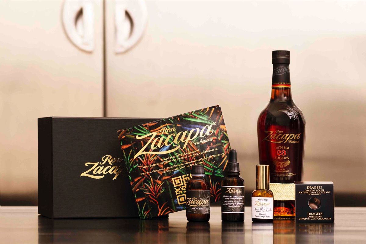 Zacapa Enchanted Dinner consegna a casa una cena d’autore accompagnata da la Enchanted Box, un suggestivo rituale di degustazione interattivo da creare e consumare nel dopopasto che comprende piccole ampolle per un consumo responsabile che custodiscono lo Zacapa 23 insieme a infusioni al caffè, fragranze edibili da nebulizzare sul bicchiere e cioccolati per esaltare le note del rum. Il tutto accompagnati da una playlist Spotify creata ad hoc e disponibile grazie a un QR code.