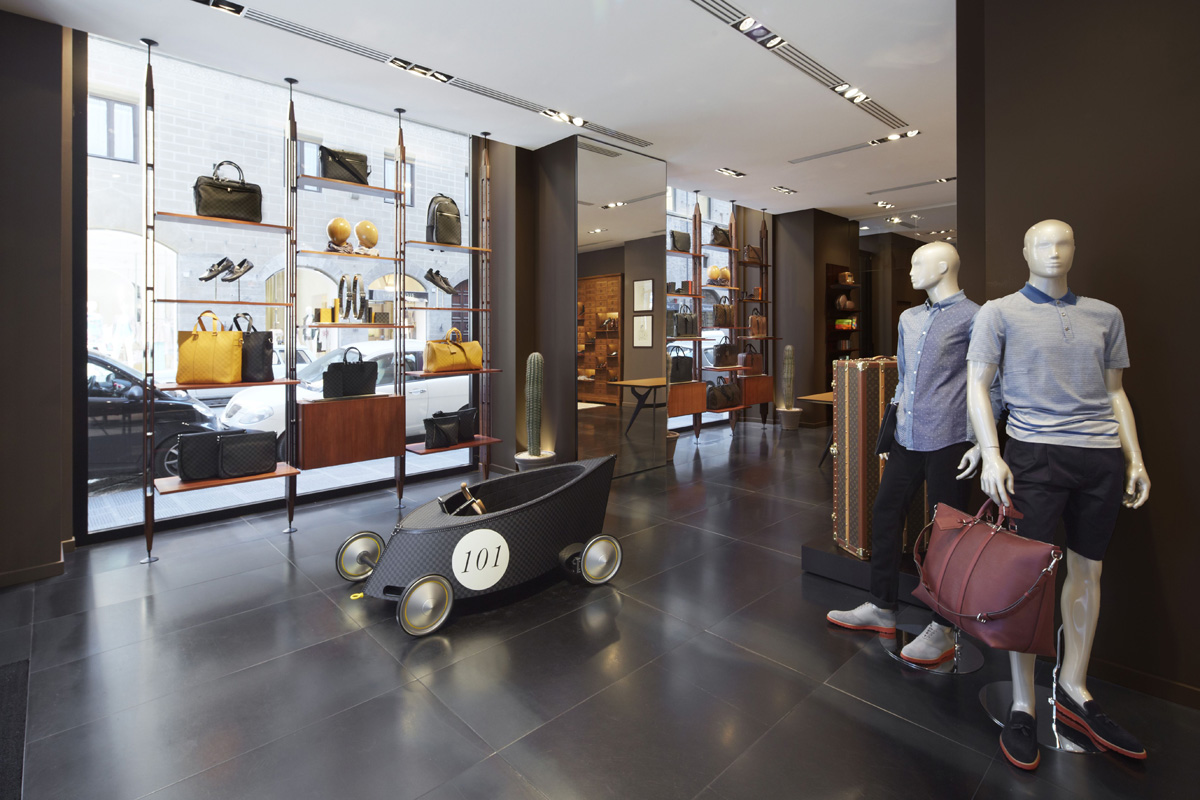 Si respira un’aria insieme familiare e di distinzione nel nuovo spazio fiorentino che Louis Vuitton ha pensato per il gentleman contemporaneo. Si accede nella già esistente boutique per la donna in Piazza degli Strozzi attraverso una porta separata ed è già la scelta dell’arredo a stupire. Una selezione del vintage più rinomato dagli anni’ 50 e 60′, che comprende la dormeuse “Cleopatra” di Dick Cordemeijer per Auping e le librerie LB7 di Franco Albini come raffinato display da vetrina- li si può acquistare, se si vuole. Alle pareti gli schizzi dell’ultima sfilata maschile, tracciati dalla mano elegante di Kim Jones, rimandano al ready-to-wear e al fior fiore della pelletteria da viaggio in vendita nel negozio: cartelle e borsoni, nel tipico motivo a scacchi o nelle nuove tonalità del giallo e dell’arancio, occhiali da sole e cinture vergate con l’iconico monogramma, e l’imbarazzo della scelta in fatto di scarpe. Presenti anche due gioiellini della gamma più sportiva: laBike Polo, la bicicletta in lega d’acciaio e alluminio per sfrecciare in città con leggerezza, e laSoap Box Racer, la macchina da corsa in miniatura rivestita in lussuosa tela damier.