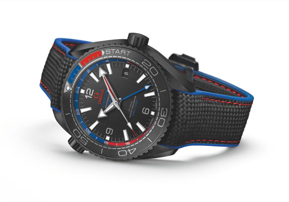 E infine un dettaglio che non potrà passare inosservato. il Planet Ocean di Omega al polso del Emirates Team New Zealand. Con la cassa in ceramica nera, il segnatempo presenta una lunetta in ceramica con scala graduata in LiquidMetal Omega che mette in evidenza i 15 minuti di countdown pre-gara: i primi 10 minuti e lo Start sono in caucciù blu e rosso (i colori della bandiera neozelandese) e gli ultimi 5 minuti in LiquidMetal. Il puntatore a ore 12 è riempito di Super-LumiNova ed emette una luce verde. Il quadrante in ceramica nero con finitura spazzolata verticale ha gli indici in oro bianco 18K ed è completato da un anello GMT con display giorno/notte. Come tocco finale al look da competizione di questo orologio, un cinturino nero strutturato con rivestimento in caucciù nero e blu e cuciture rosse, e con la nuova fibbia in ceramica nera spazzolata.