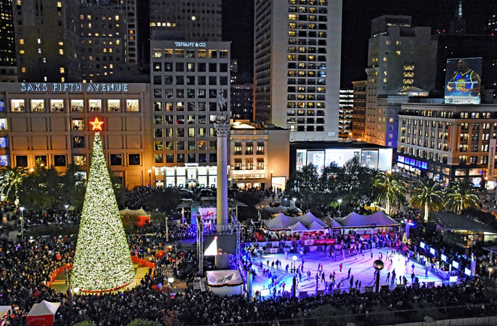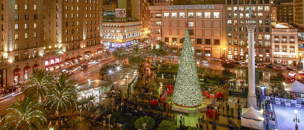 Il fulcro delle feste in città è Union Square, dove si fa un grande Albero di Natale, e c’è una bella pista di pattinaggio sul ghiaccio. Tutt’intorno ci sono bancarelle, installazioni artistiche, e quasi ogni sera si organizza qualche evento. L’hotel Westin St. Francis, che si affaccia sulla piazza, ha in mostra diverse gigantesche torte, talvolta percorse da trenini, mentre il Fairmont Hotel, a Nob Hill, raggiungibile da qui anche in cable car, in questo periodo ha veramente decorazioni natalizie spettacolari, con perfino una casetta di pan di zenzero.