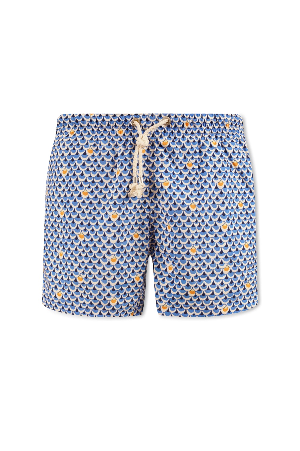 Hanno poi le stelle delle carte napoletane, o le figure geometriche delle maioliche dipinte a mano delle Isole Eolie, il cornicello in corallo e dettagli d’alta sartoria come la corda nauticha che chiude la vita, come quelle usate per issare le bandiere in barca, tessuti spazzolati che si asciugano in un attimo e taschini con velcro interni per custodire le chiavi della cabina.