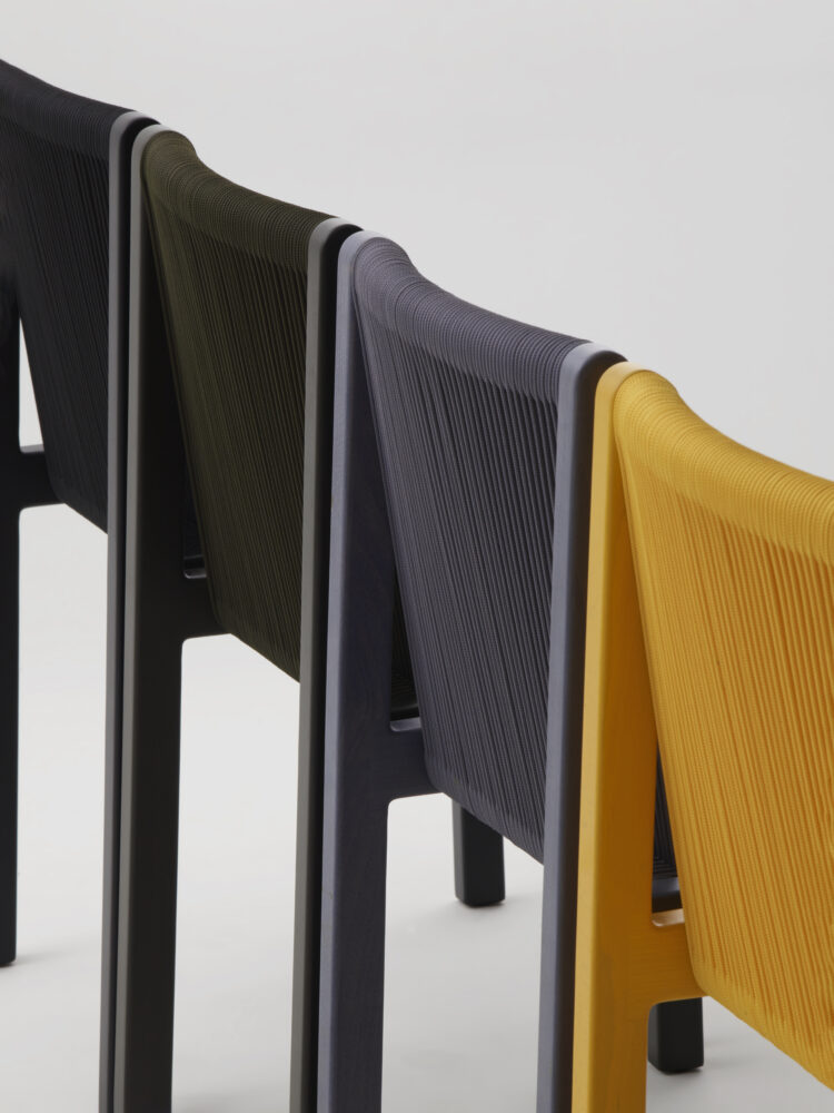 Vista di lato, Filo appare come una lettera quasi tipografica. La bella trovata è però nelle linee ripetute del cavo di tessuto che compone seduta e schienale che si distorce sottilmente quando il corpo si siede, dando una forma morbida e personale alla sedia. Ora, anche il tema del filo come materiale ha almeno un “antenato” prestigioso, cioè la Spaghetti Chair di Giandomenico Belotti per l’esordio di Alias, nel 1979 (tu pensa, la sincronicità delle date). Struttura in legno massiccio di faggio, progettata per ridurre lo spreco di legno (qui è faggio europeo), Filo lavora sull’equilibrio tra pulizia della struttura, cioè anche riduzione dello scarto in lavorazione, e forza nelle linee. 4 colori sia per la struttura sia per il filo: nero, grigio, giallo e verde. Abbiamo bisogno di un’altra sedia? Se è bella, allora sì.