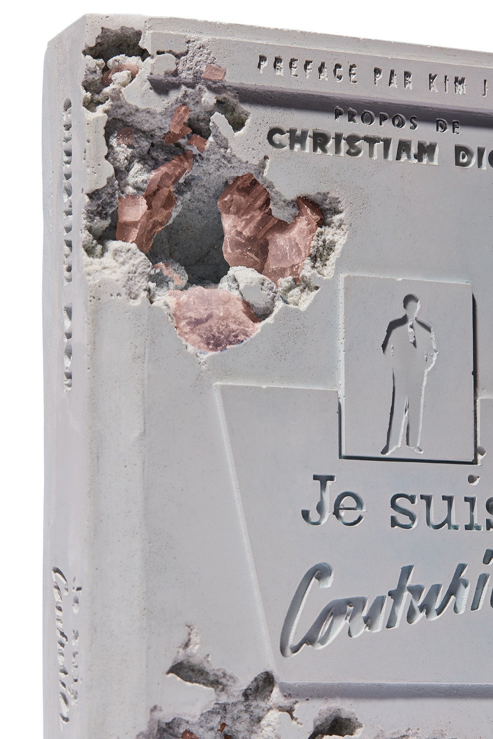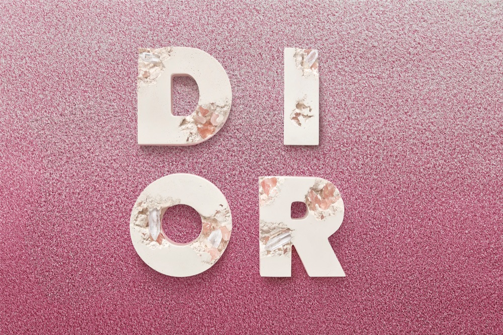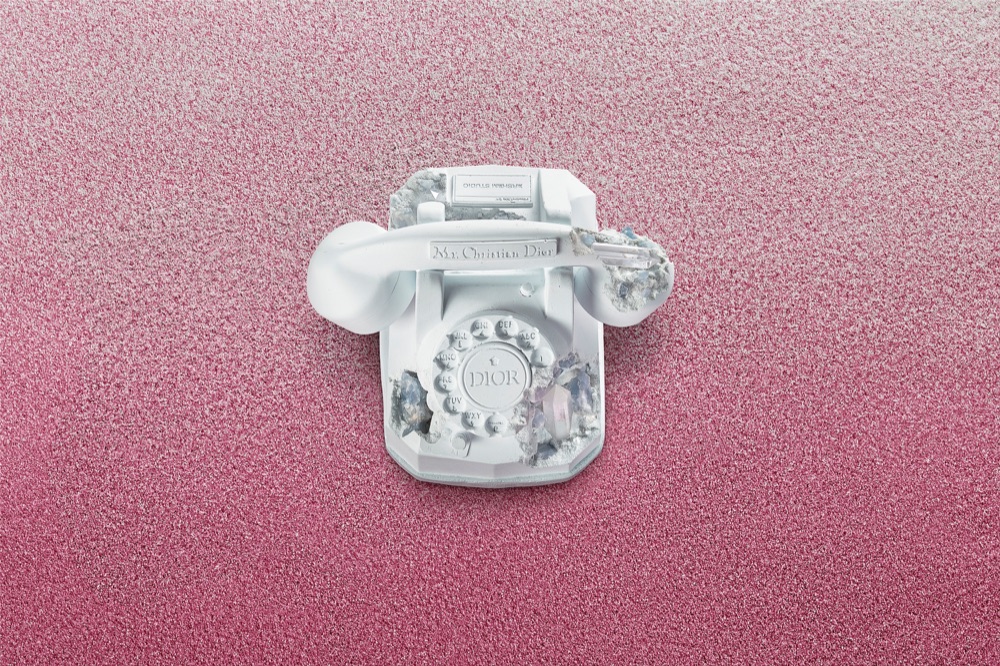 C’è il libro di Christian Dior ‘Je suis couturier’, pubblicato nel 1951, con una finitura leggermente erosa tempestato di cristalli. Il suo telefono da scrivania e l’orologio diventano riflessi di un’eternità fantasy. Miniature sorprendenti replicano le lettere ‘D.I.O.R’ che hanno decorato il set della sfilata uomo ss20 fino al pallone da pallacanestro, vestito di rosa.