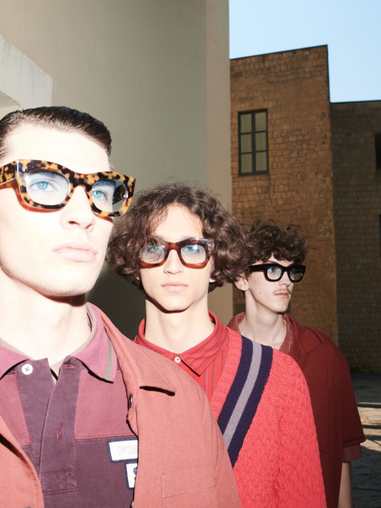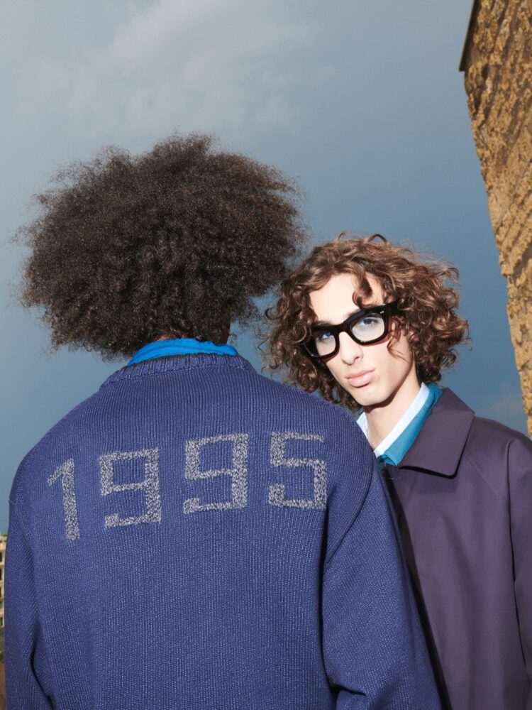 I trench hanno interni a contrasto, i piccoli blouson colli di velluto. Sahariane, anorak, blazer boxy si mescolano a pantaloni affusolati, shorts, scarpe da boxe, berretti da baseball. Le proporzioni inattese suggeriscono un dialogo simbolico tra mondo degli adulti e quello dei più giovani.