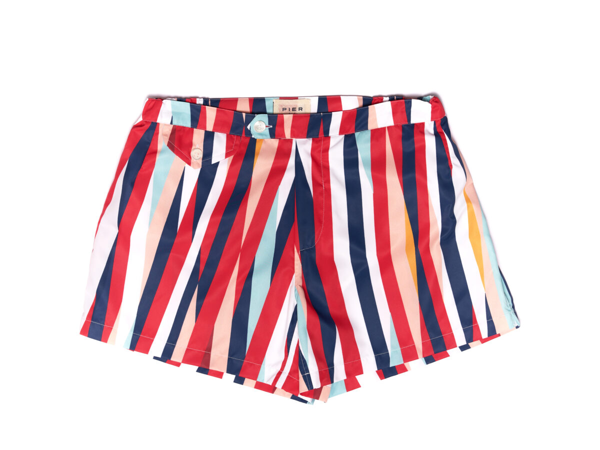 Pier Sicilia Marcello, è un costume da bagno ispirato all’arte astratta caratterizzato da una grafica geometrica che sfugge ai formalismi estetici. L’accostamento dei colori è ispirato alla Sicilia, terra vibrante di contrasti forti. Elastici in vita, piccole pinces interne, taschino con patta chiusa da bottone in madreperla.