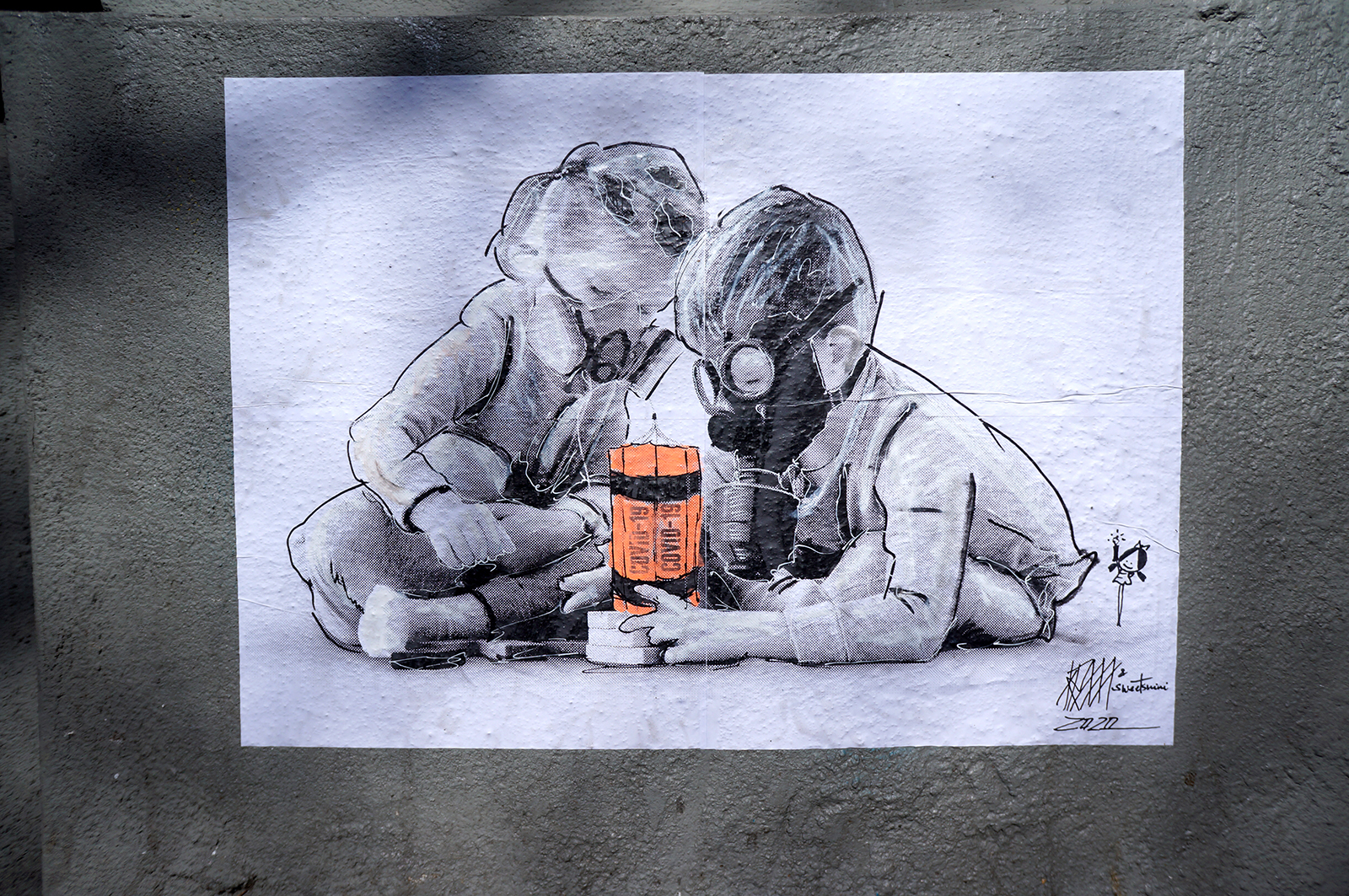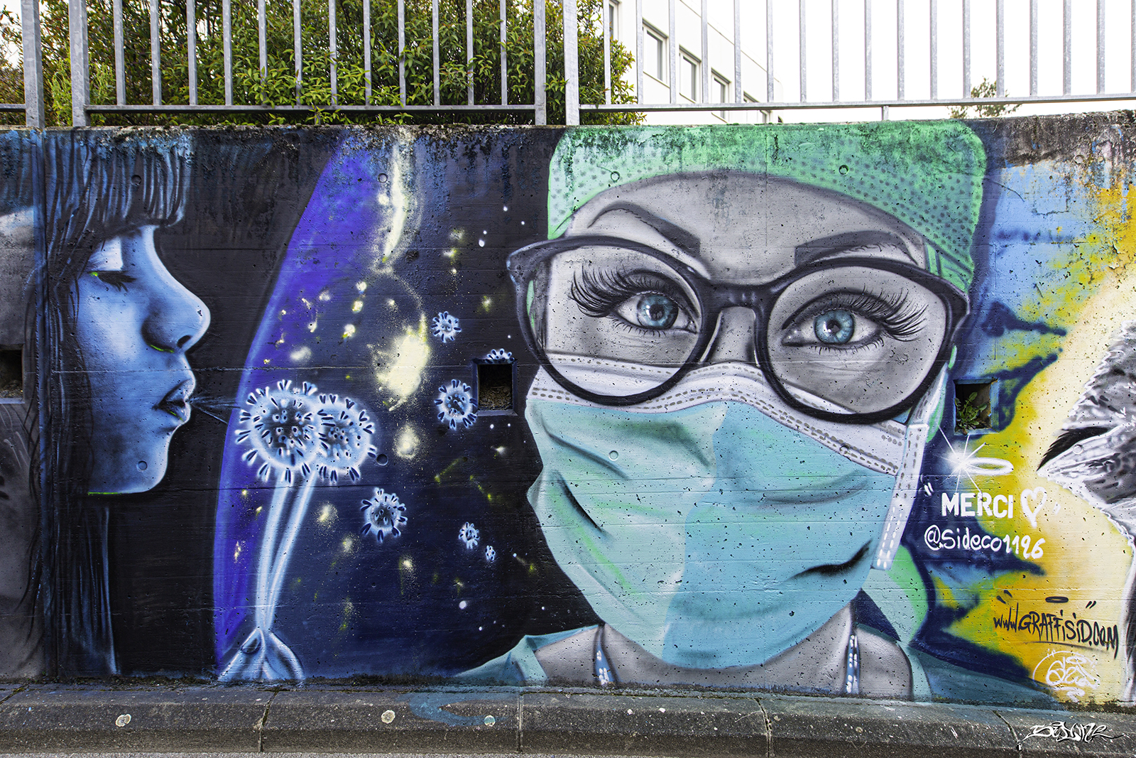 Mai come ai tempi del corona virus, gli artisti sono stati attivi e la creatività è in pieno fermento, con l’immaginazione che corre a luoghi e sogni lontani, ristretta tra le mura domestiche. Ma cosa succede per strada? Gli street artist hanno continuato a riempire i muri e gli angoli delle strade di opere d’arte, ispirate proprio al momento. Uno stupendo libro ripercorre come il corona virus abbia influenzato la produzione artistica nelle strade in questi ultimi mesi. Street Art in the Time of Corona, edito in inglese da Graffito e in tedesco, Street Art in Zeiten von Corona, da MIDAS COLLECTION, scritto e curato da Xavier Tapies, offre una splendida galleria di immagini. A volte fanno sorridere, sempre emozionano, talvolta portano a riflettere e sono irriverenti e provocatorie, oppure celebrano quelli che sono stati gli eroi di questo periodo nero, come infermieri e operatori sanitari. “Di tutte le forme d’arte, solo la street art è stata in grado di riflettere il tempo straordinario in cui il virus Covid-19 ha invaso il mondo nel 2020. All’improvviso, il lugubre mietitore del Medioevo è parso gettare sottosopra il nostro mondo globalizzato, attentamente ordinato, orientato al consumatore. A livello nazionale e internazionale, l’umore oscilla di giorno in giorno. Molti politici cercano, spesso goffamente o addirittura inutilmente, di suggerire un modo per affrontare il virus. Alcuni scelgono di ‘seguire la scienza’, anche se gli scienziati non sono d’accordo tra loro. Le economie sono crollate dall’oggi al domani e sono sopravvissute solo con denaro contraffatto. Questo non sembrava essere il momento per ‘l’arte alta’, che, ad eccezione della Guernica di Picasso, di solito fallisce comunque quando si tratta di catturare i sentimenti profondi della maggior parte delle persone moderne che affrontano una crisi esistenziale. Tanti artisti di strada hanno aperto una breccia: hanno infranto le regole come al solito e sono scesi in piazza” scrive Tapies nell’introduzione al libro.