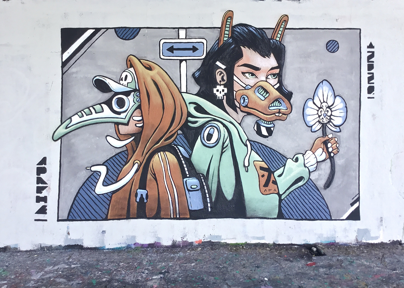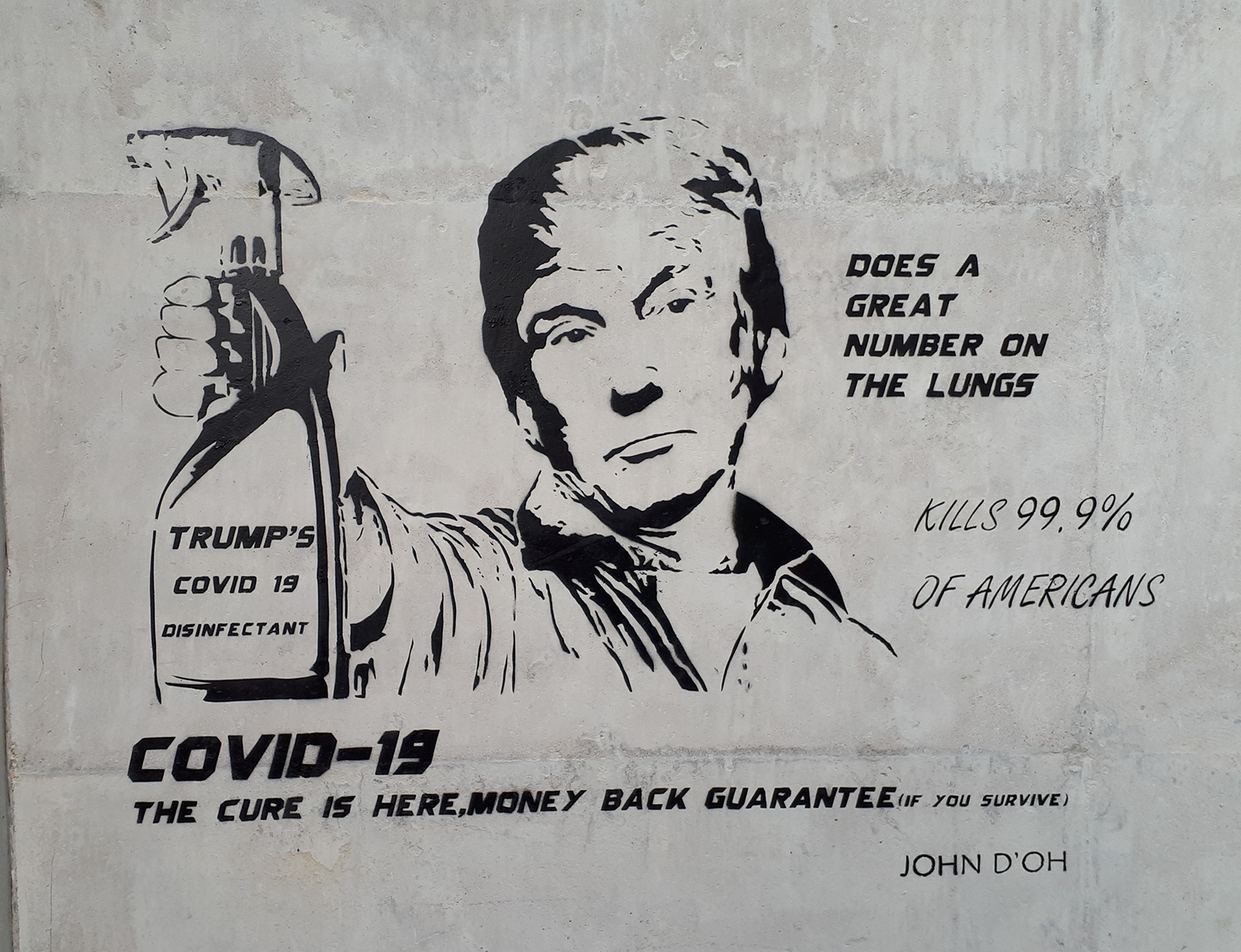 Tutte le immagini che si vedono colpiscono per un motivo o un altro. Così si vedono i personaggi di Ben Apache, a Vienna, in Austria, con maschere al viso: ma una è il Dottore della Peste e l’altra simile a un animale che cerca salvezza nella natura. I bambini di ARMX e Sweetsnini, a Cologna, in Germania, giocano con una bomba di Covid-19. BustArt, a Binningen, in Svizzera, rappresenta un’infermiera con un’ombra da Wonder Woman. Due ragazzi si baciano con le mascherine al viso travolti da colori in un’immagine di romanticismo senza tempo in uno stencil di C215, a Ivry-sur-Seine, in Francia. Un Bart Simpsons viene soffocato dentro una nube di corona virus in un’opera di Cel Out, a Melbourne, in Australia. John D’oh mostra un ringiovanito Trump con un igienizzante di sua invenzione che promette una cura, a Bristol, in Inghilterra. “STAY HOME / LIFE IS BEAUTIFUL” scrive un artista sconosciuto su un muro colorato di rosso del quartiere di Shoreditch, a Londra, in Inghilterra. Ma queste sono solo alcune delle tante impressioni che si scoprono scorrendo le pagine, quasi inseguendo la corrente impetuosa di un fiume… E, poi, c’è Pøbel, i cui amanti che si baciano appassionatamente con mascherine ai volti in un abbraccio sexy, su un muro di Bryne, in Norvegia, ho colpito talmente al cuore da finire proprio sulla copertina del libro e da divenire iconici.