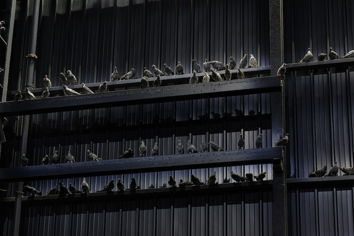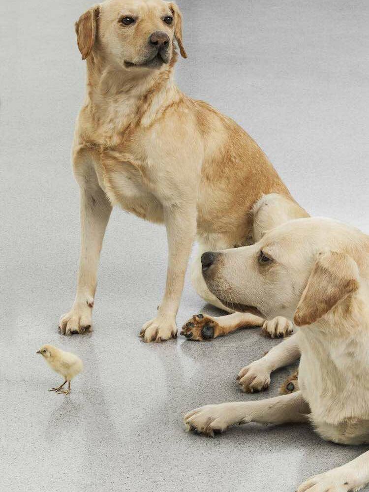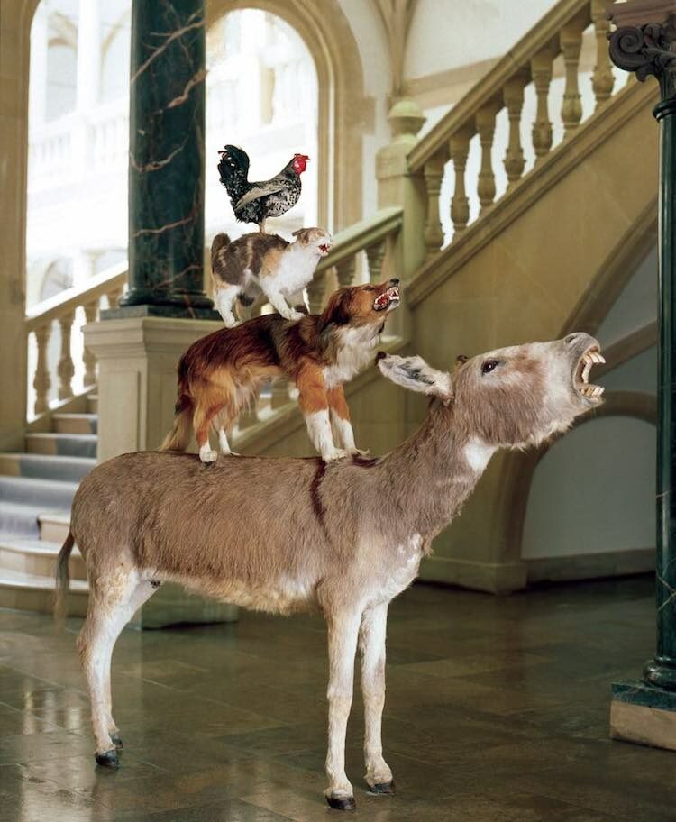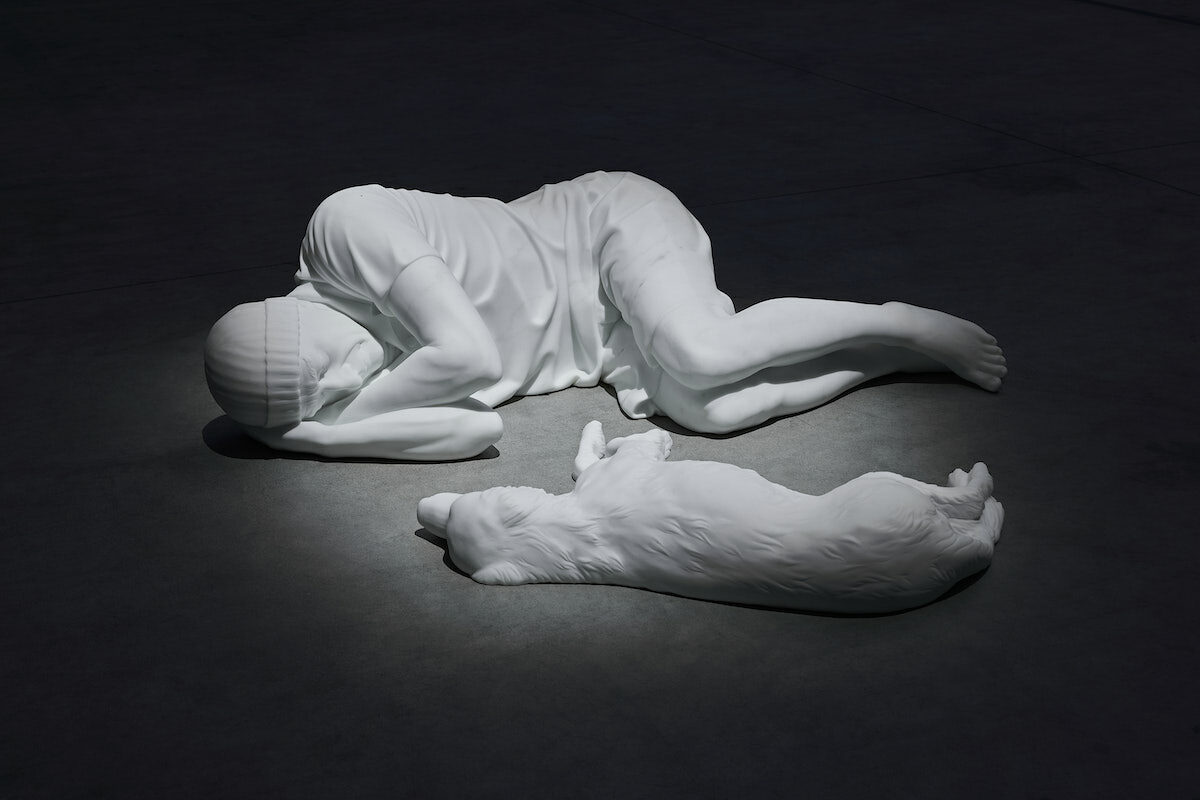 Cani, cavalli, elefanti, scoiattoli: nel tuo lavoro gli animali compaio molto spesso. Anche nella mostra ‘Breath Ghosts Blind” è presente la scultura in marmo bianco di Carrara, di un cane e di un uomo, stesi, uno di fronte all’altro, e la grande installazione Ghosts, composta da migliaia di piccioni tassidermizzati. Perchè utilizzi spesso gli animali? In particolare, che relazione c’è, nella scultura Breath, tra l’uomo e il cane?