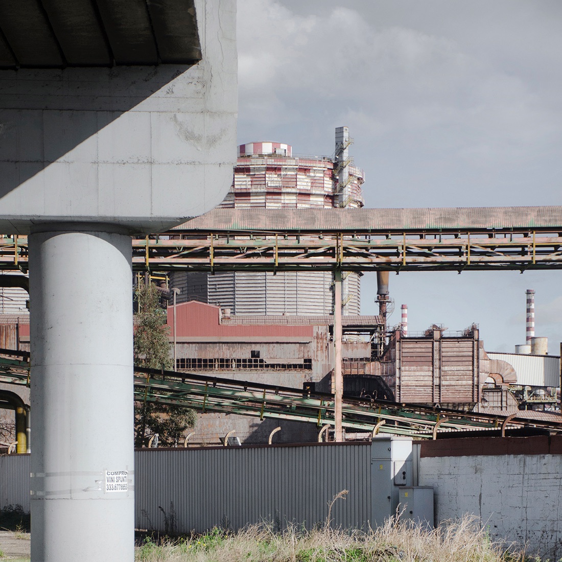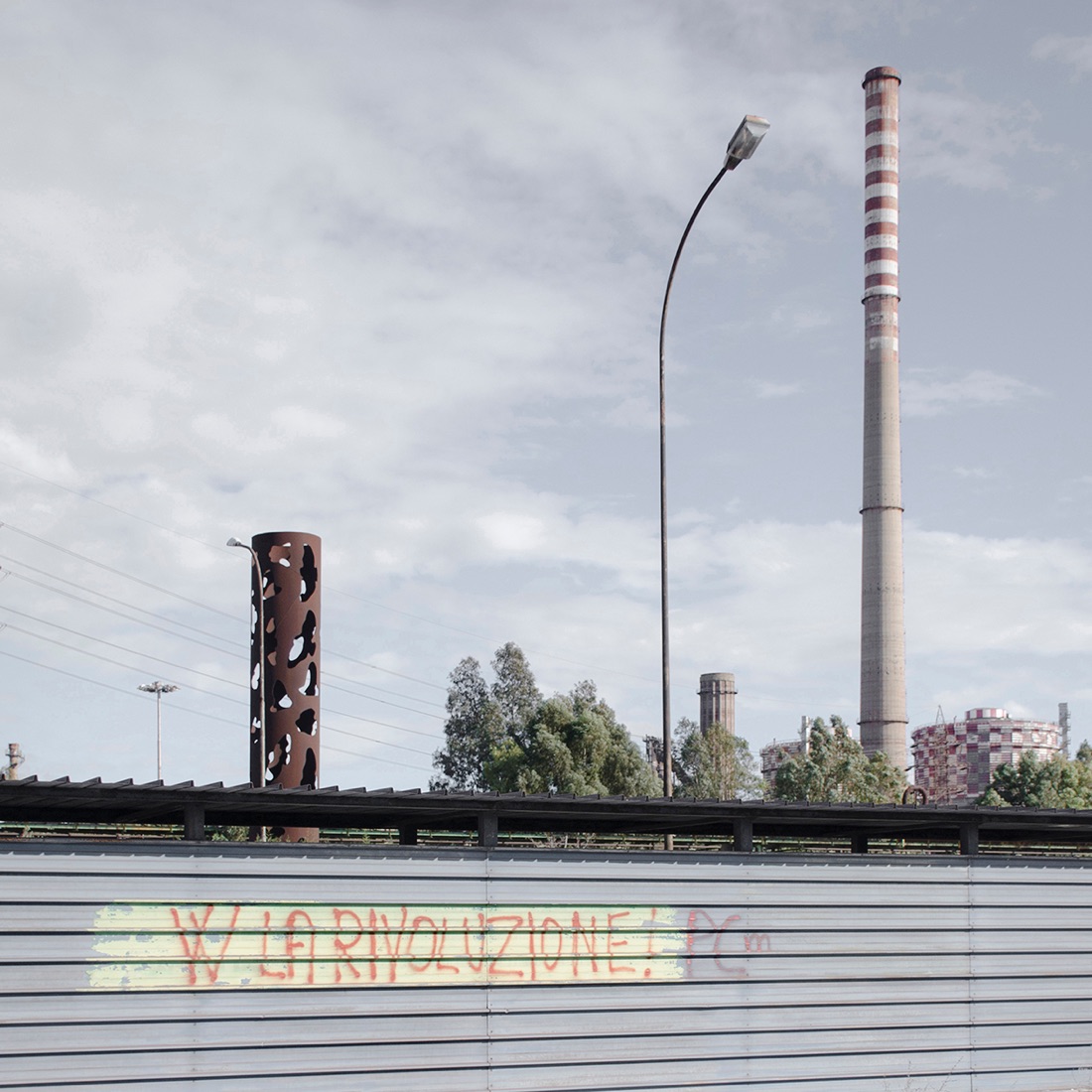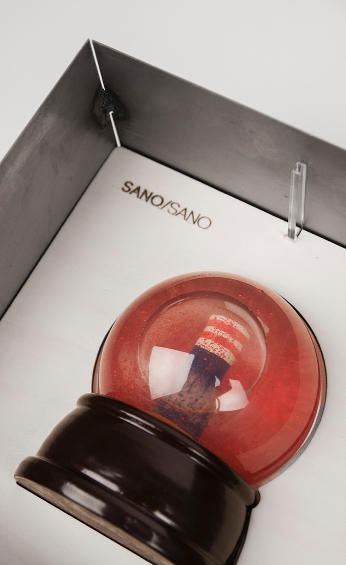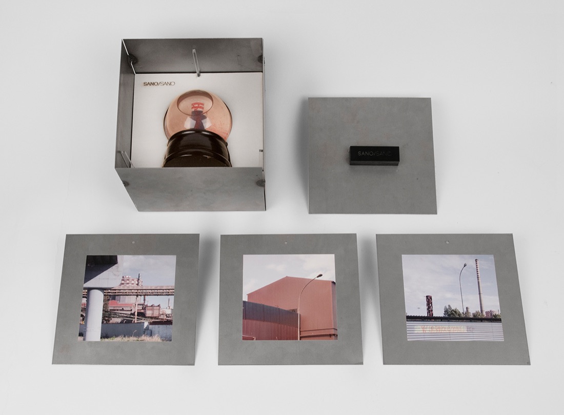 Una scatola di ferro con un magnete nero per manico che riporta la scritta Sano/Sano. Dentro, tre fotografie montate a loro volta su ferro e una palla di vetro, di quelle che solitamente si riempiono di fiocchi di neve a capovolgerle, con dentro il souvenir di una ciminiera e le polveri rosse sottili che lentamente si depositano ai suoi piedi.