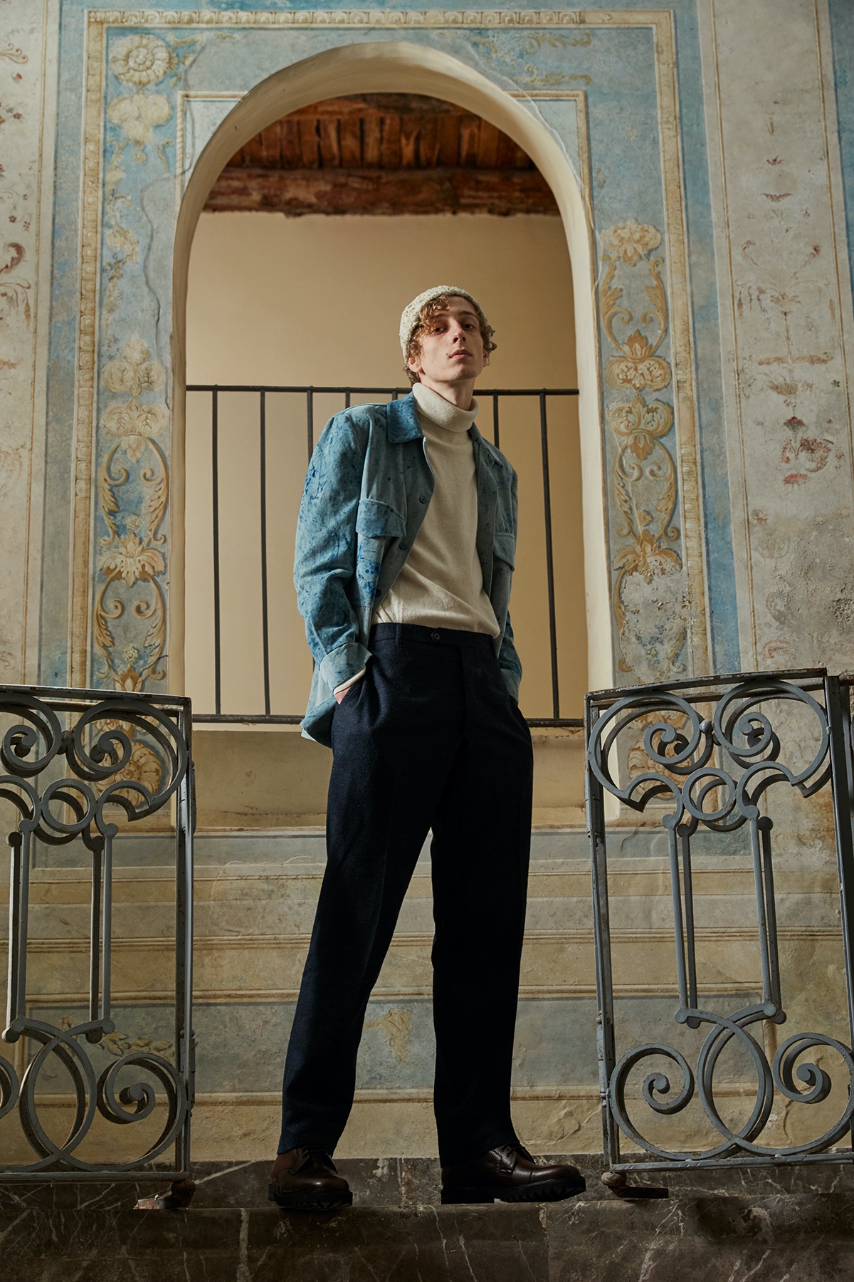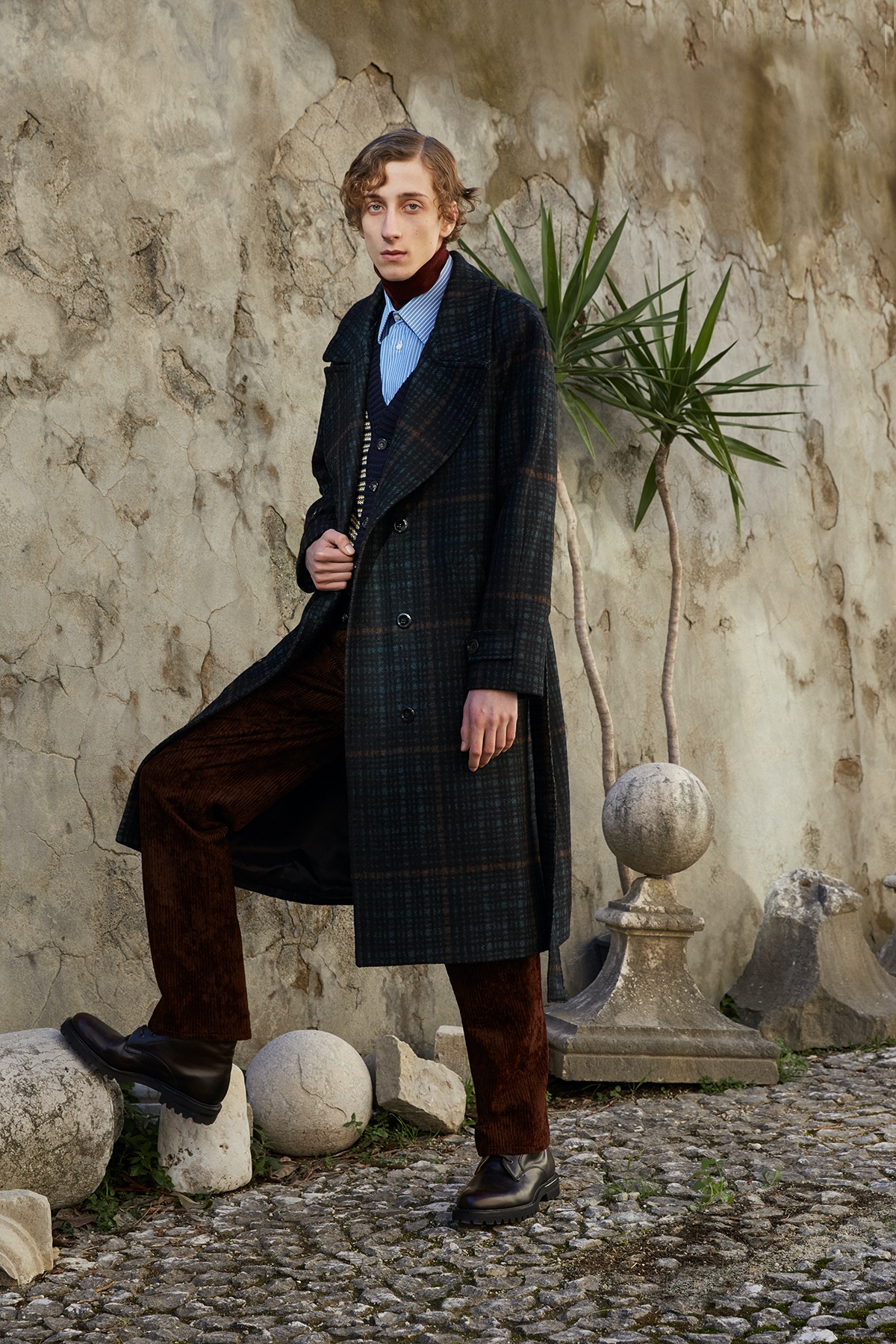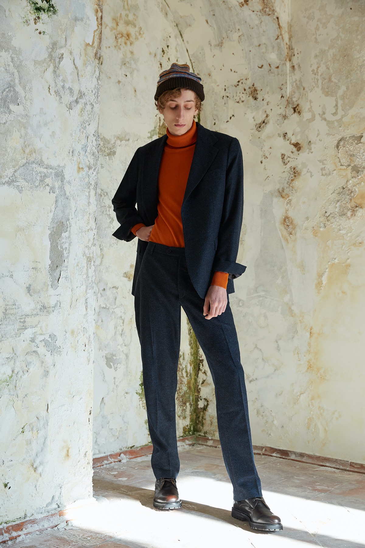 La cura dell’anima è una riscoperta priorità contemporanea. Oggi il nuovo focus di ricerca per l’uomo è il raggiungimento di un possibile stato di grazia, fatto di contemplazione spirituale, in cui la moda diventa espressione visiva di un proposito tanto ambizioso. Lo sa bene Luca Larenza che nel racconto della sua nuova collezione del prossimo inverno propone un modello esistenziale connotato da buone letture, mette tra le opzioni la possibilità di condurre una vita decentrata dalle grandi metropoli, che ponga come valore assoluto l’immersione, quasi religiosa, nella natura.