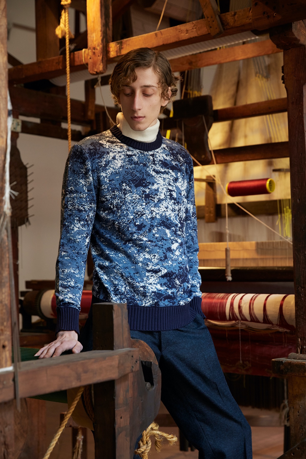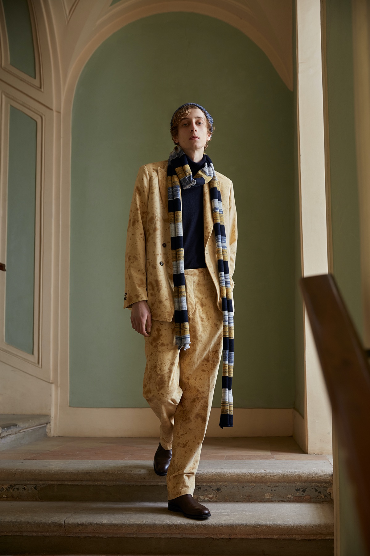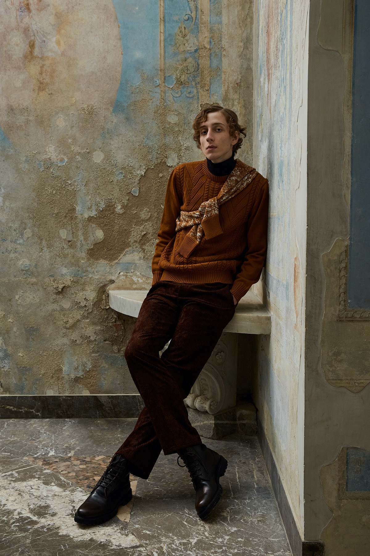 I giovani pensatori di Larenza indossano completi con effetto macchiato in velluto Maltinto, una colorazione naturale al tannino, nei toni del beige o del blu. Il motivo ‘a macchie’ viene tradotto anche sulla maglieria in merino extrafine con la tecnica del Jacquard. Pure i cardigan sono in morbida lana merino a punti alternati, a coste larghe, nei toni del blu-navy, senape e latte. I maxi-pull in lana con motivo ‘pixel’ multicolor vengono lavorati in Jacquard con collo spesso e resi in senape con motivo a trecce.