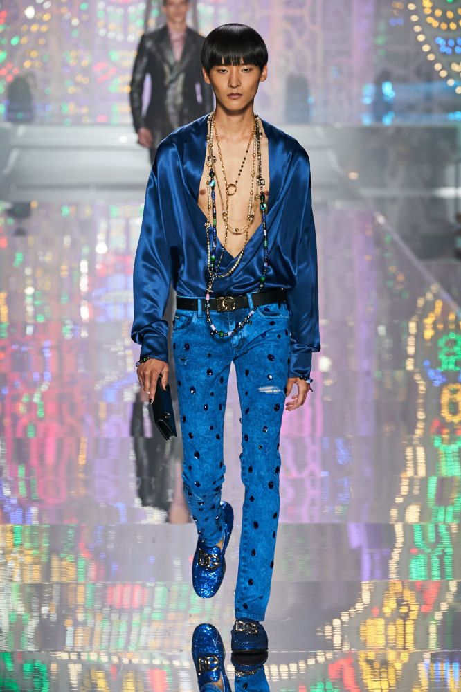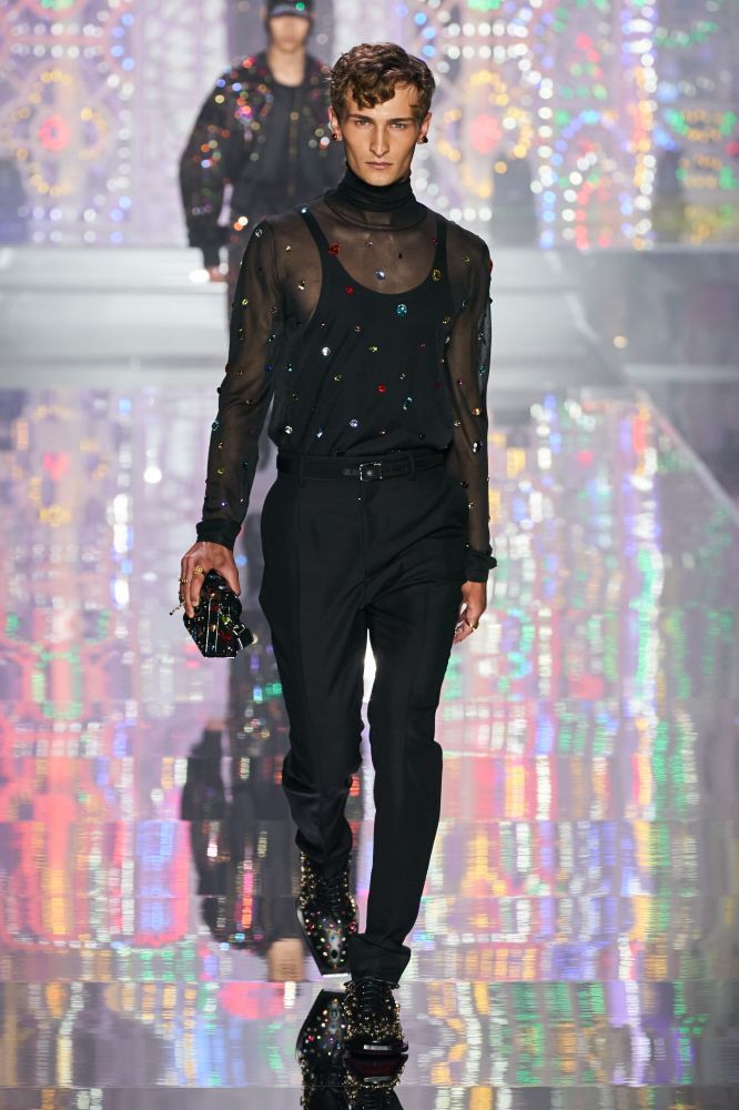 Anche da Dolce & Gabbana hanno presentato nuove versioni di borse da uomo. In uno scenario tra luminarie e lucine che celebrano la bellezza e le tradizioni dell’Italia, ad accompagnare i look dall’attitude anni 2000 c’erano clutch da sera compatte e mini trunks con pietre scintillanti incastonate.