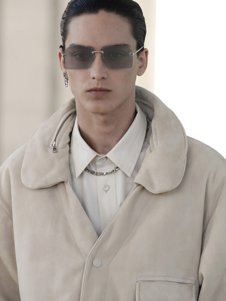 La collezione celebra nuovi volumi sartoriali. Le giacche in lana sono tagliate al busto, o con inserti in organza di nylon; i blazer in lino con revers a punta sono dotati di taschino portapenne e scomparti per gli auricolari. Le tasche cadono sotto l’orlo e le giacche si sbottonano lungo i fianchi.