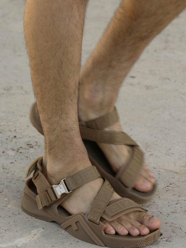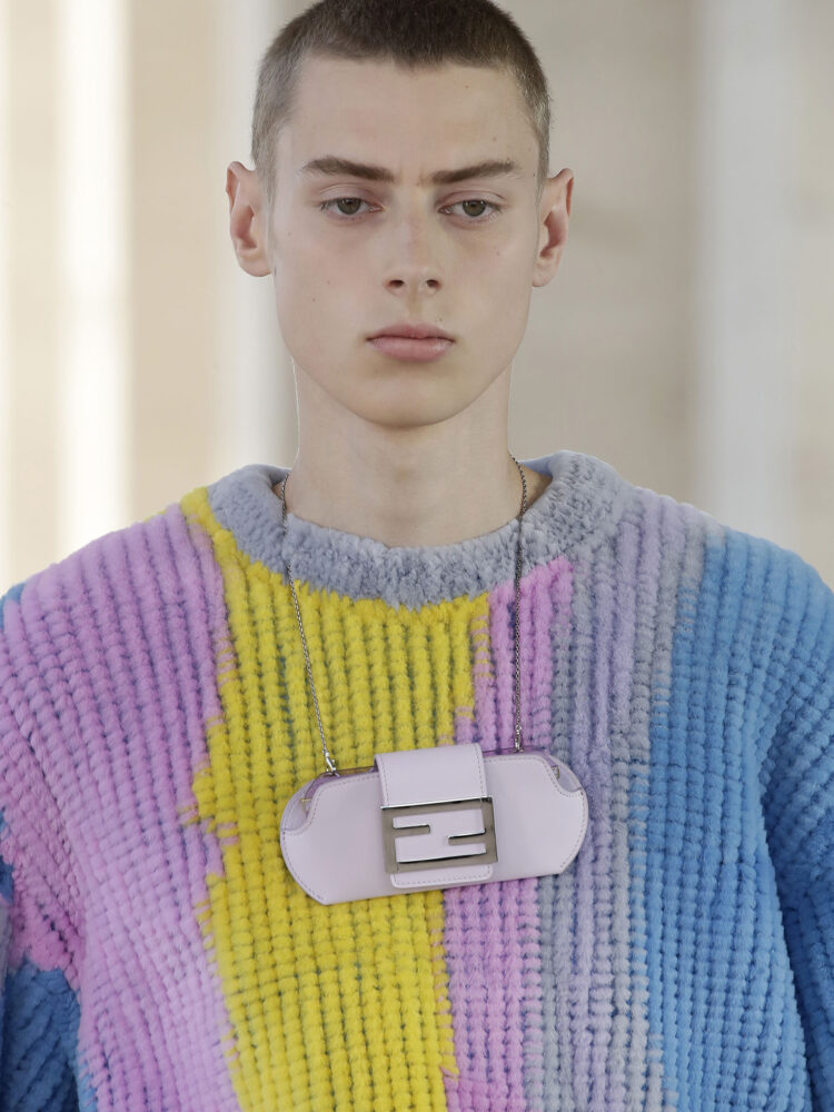 Silvia Venturini Fendi disegna la collezione maschile primavera-estate 2022 di Fendi attraverso lo sguardo panoramico che si può avere dal tetto del Palazzo della Civiltà Italiana all’Eur, sede della maison. La natura e l’architettura si fondono su una scenografica tela dai colori tenui, che si trasformano nel corso della giornata, per rivelare la multiforme topografia della regione attraverso una luce che muta all’infinito.