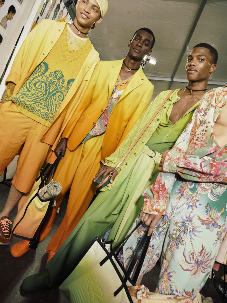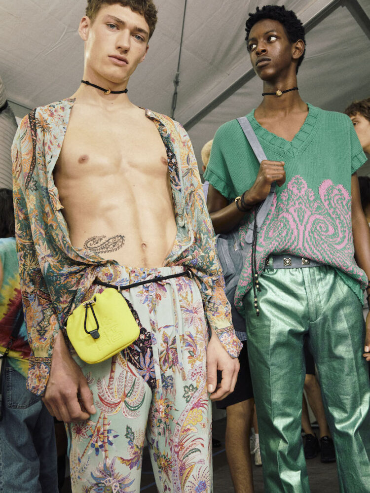 Capi più sportivi, indossati sopra ai caftani, sono realizzati in cadi di seta e i classici gilet tennis di Etro in maglia svelano inserti in georgette. Trasparenze muovono le silhouette, le camicie fil coupé sono arricchite da fili dorati, mentre i pantaloni metallici in canvas spalmato sono la divisa di viaggiatori intergalattici. I riconoscibili pattern della maison, che richiamano il mondo degli interiors, si fanno rarefatti per dare un tocco grafico ai pigiama in seta, simboli arcaici decorano shorts e bomber ricamati, mentre messaggi di amore e ottimismo sono stampati sui trench e sulle etichette dei capi.