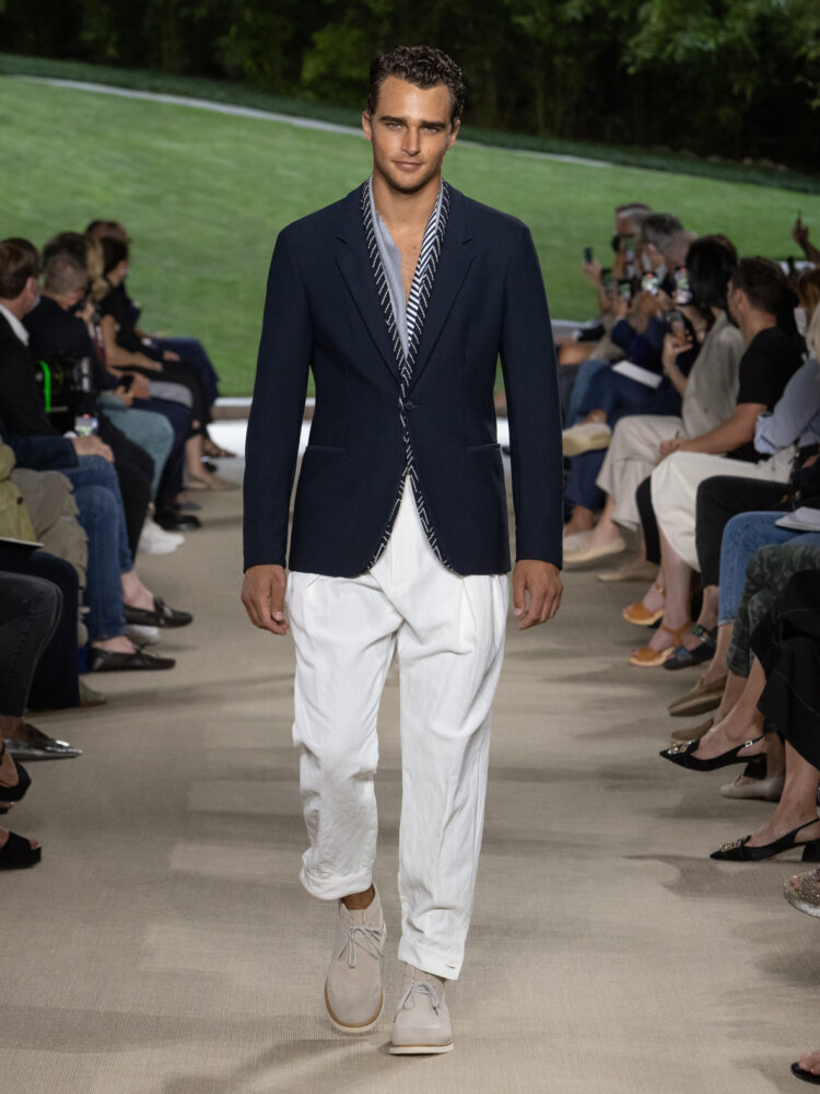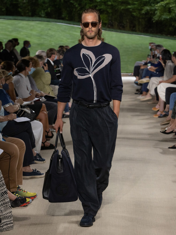 La collezione di Giorgio Armani per la prossima stagione calda è un ritorno alle origini. Lo stilista torna a esplorare l’idea dell’abito che libera invece di costringere, della leggerezza di pensiero invece della sventatezza, del classico come segno di progresso. Lo fa osservando il tempo in cui viviamo, il senso condiviso del vestire che si allontana sempre più dalla formalità e abbraccia con decisione lo sportswear.