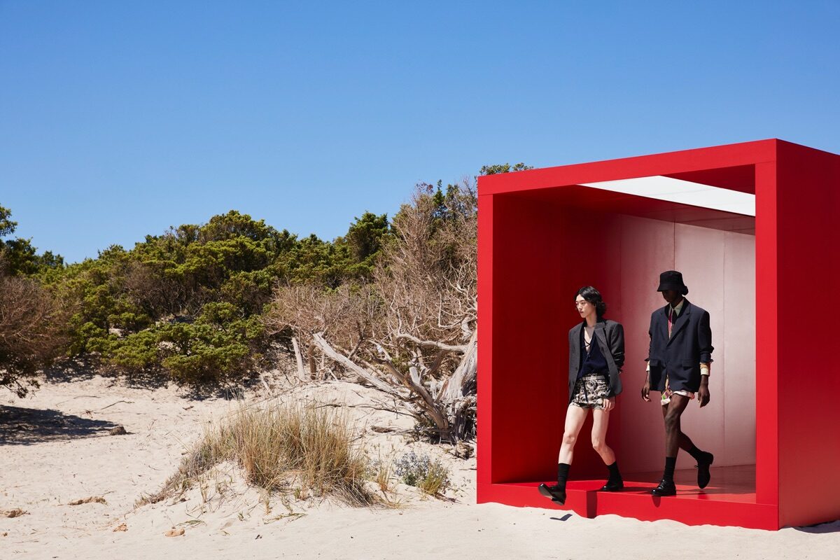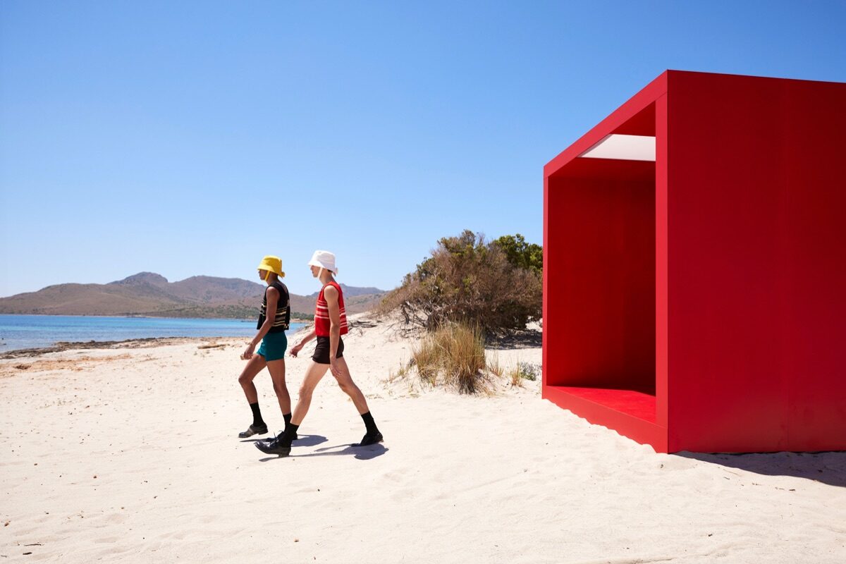 Il video che racconta la nuova collezione è una misteriosa fuga estiva che si conclude in uno spazio in cui natura e artefatto interagiscono. Percorrendo un tunnel rosso e tortuoso, siamo portati in un ambiente nuovo ma familiare. Sdraiati sulla sabbia tra massi di granito o galleggianti sul mare limpido, oggetti rossi in legno apparentemente incagliati si godono il paesaggio incontaminato: un incontro surreale con la natura, un’inattesa infrastruttura balneare.