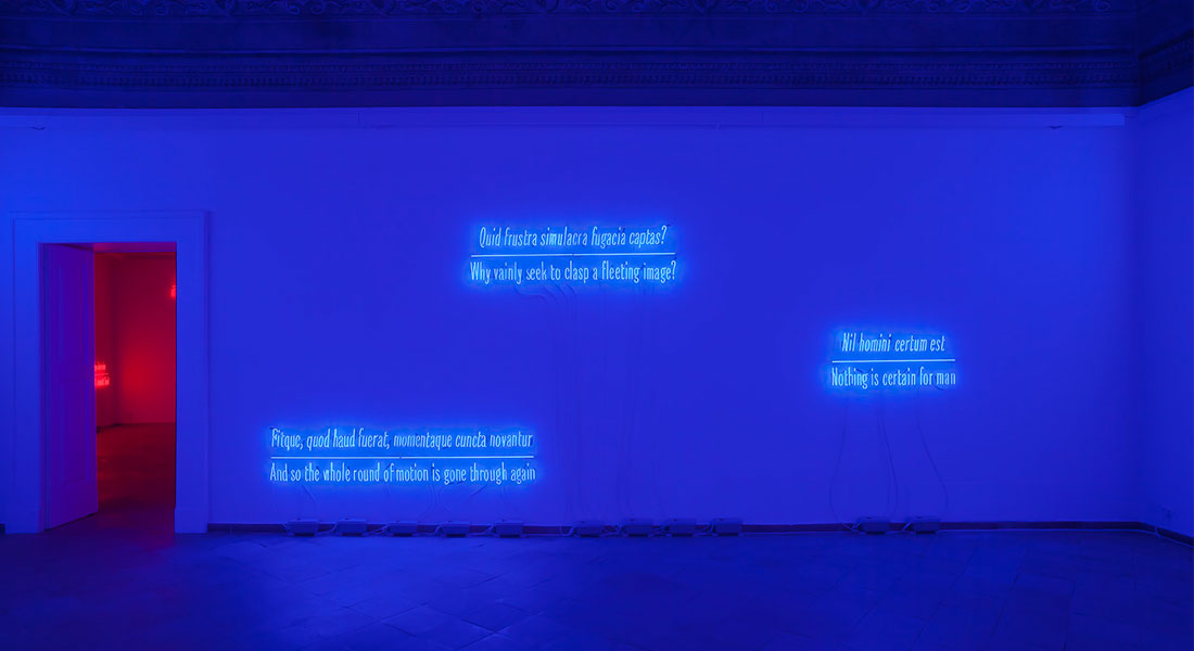 Durante la sua carriera, ha preso in prestito parole, frasi e addirittura intere biblioteche per impregnarle di significati altri. L’artista concettuale americano Joseph Kosuth si rivolge ora a Ovidio con Maxima Proposito, una serie di installazioni site-specific sviluppate per la Galleria Vistamare di Pescara. Ad abitare le quattro stanze della Galleria – ognuna di un colore diverso – sono dei neon che recitano alcune frasi scritte da Ovidio durante il regno d’Augusto. Frasi dalla valenza storica, a cui però Kosuth sceglie di non imprimere nessun significato particolare. Sono i fruitore delle opere a costruirlo. È infatti il contesto, secondo l’autore, che determina il significato di un’opera. Pescara, Galleria Vistamare, fino al 2 marzo 2018.