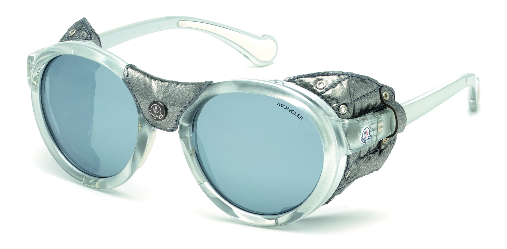 Omaggio agli eslporatori di un tempo, le nuove mascherine di Moncler si indossano (anche) in alta quota. Il modello ML0046, unisex, ha paraocchi laterali in pelle rimovibili come anche l’inserto sul ponte. Gli elementi in pelle sapientemente inseriti garantiscono la massima protezione contro la luce. Il fit aerodinamico delle aste trae ispirazione da forme tipiche di imprese ad alta quota mentre le lenti anti-riflesso polarizzate si alternano a quelle a specchio.