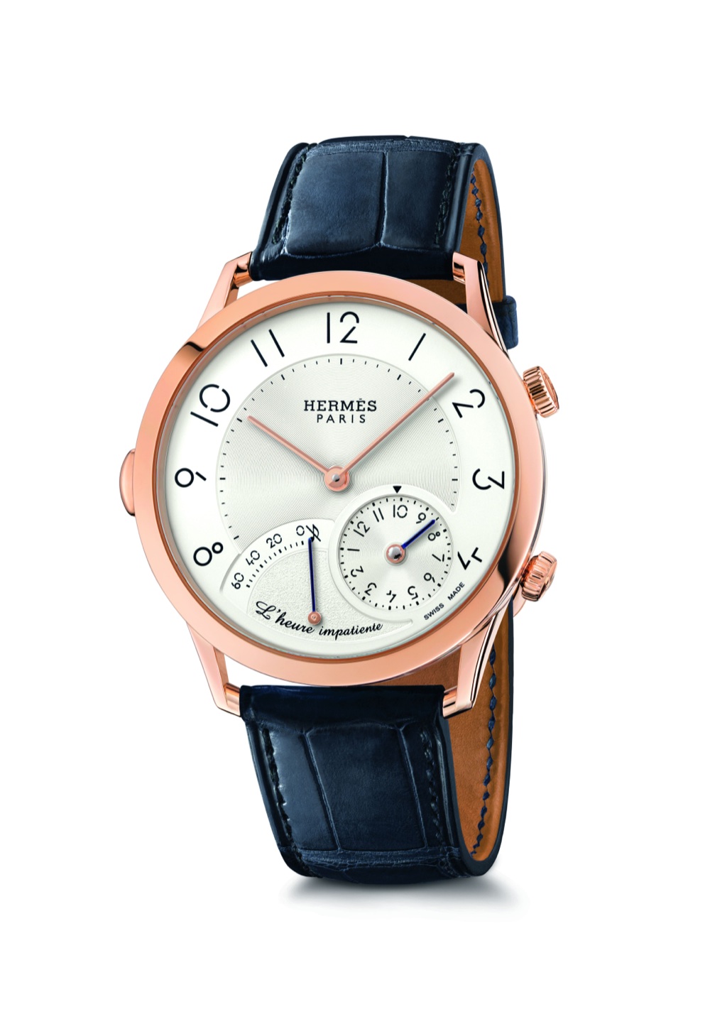 Il proposito di L’heure impatiente è quello di celebrare un rituale che consiste nel fissare sul contatore dell’orologio l’ora di un evento atteso, previsto entro le dodici ore seguenti. Un’ora prima che esso abbia luogo, si avvia la clessidra meccanica, la cui progressione è visibile sul quadrante alle ore 6. All’ora prefissata risuona una nota, un’unica volta. Il suo timbro è stato studiato per farla durare a lungo, generando un suono vellutato e discreto. Solo chi indossa l’orologio ne distingue il tono. Il tutto è racchiuso in un modulo di soli 2,2 mm di spessore, animato dal movimento di manifattura H1912.