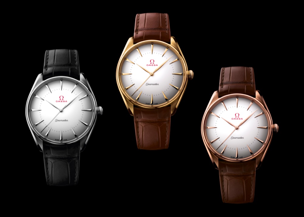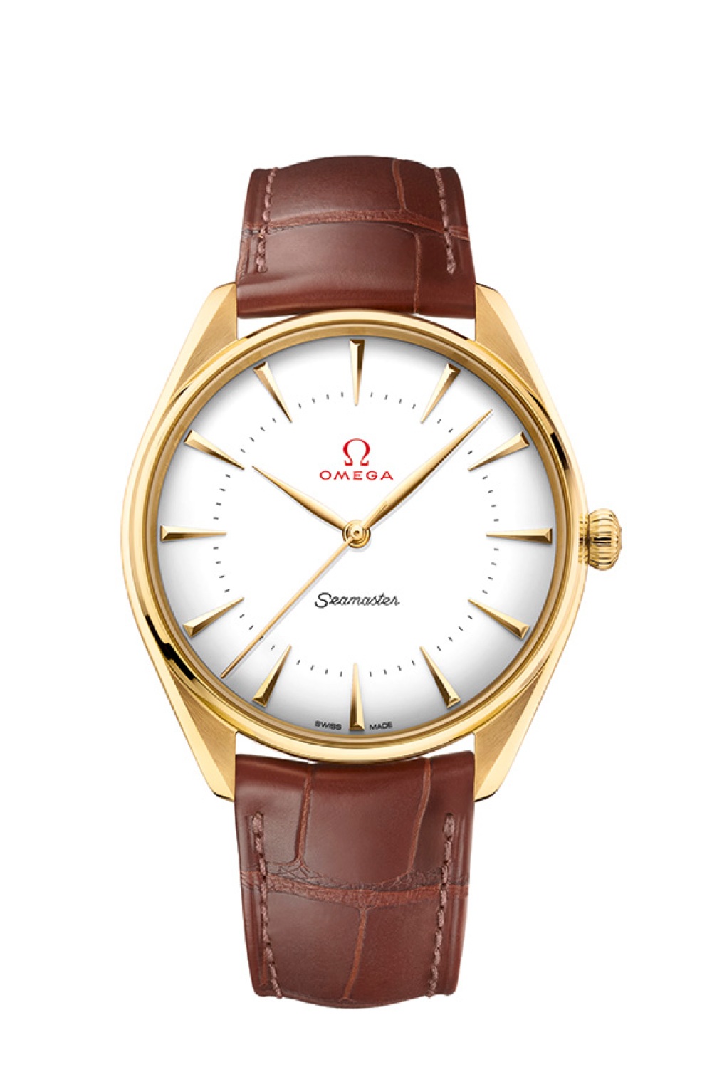 L’oro 18K è utilizzato inoltre per le lancette dal design a “foglia” e per gli indici applicati, mentre i quadranti bombati sono in smalto bianco, con il caratteristico logo Omega vintage, la traccia dei minuti e il logo Seamaster smaltato.