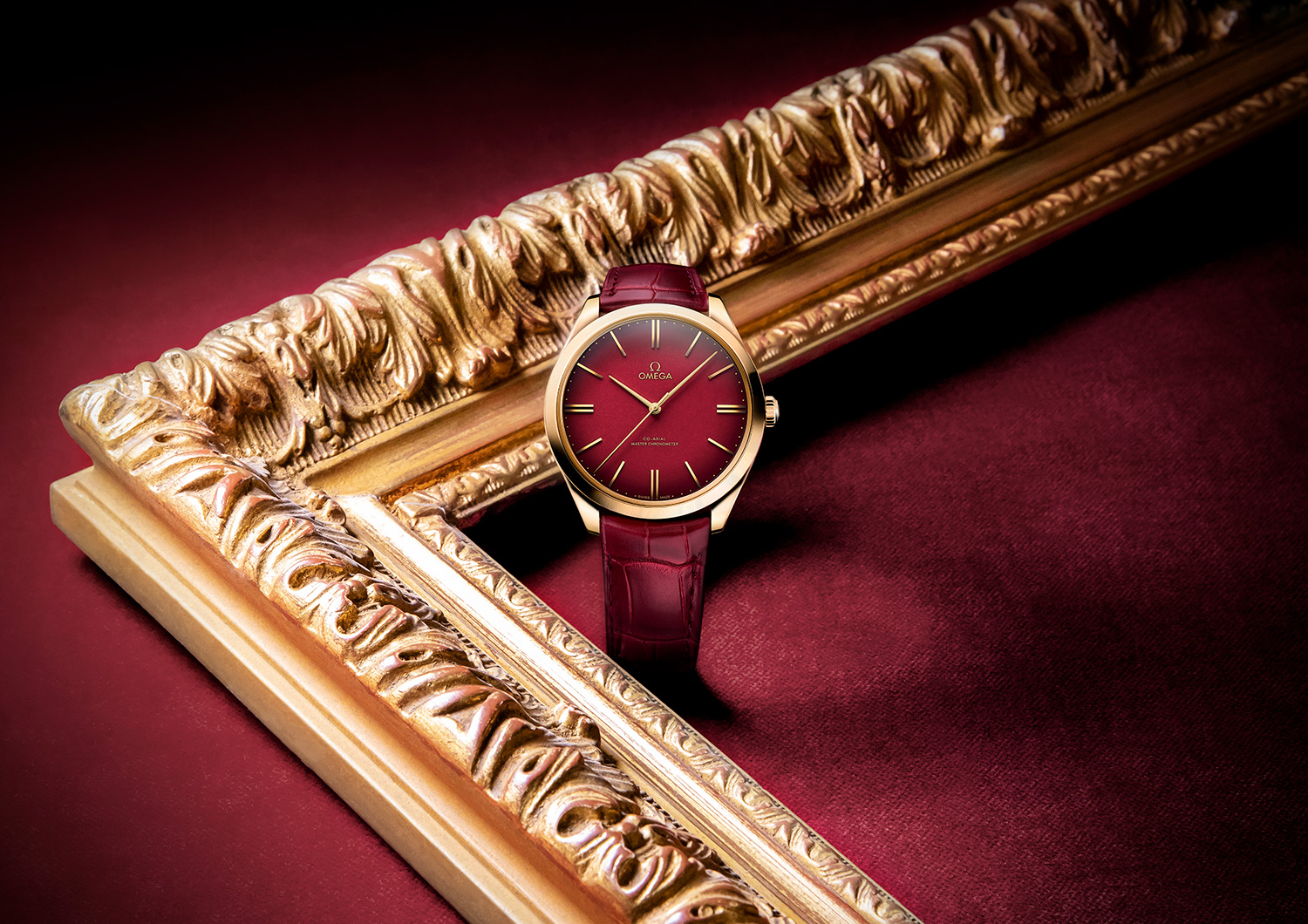 La prima è il De Ville Trésor 125th Anniversary Edition, con cassa in oro giallo 18K, cinturino in pelle bordeaux e quadrante in smalto rosso. Il fondello è impreziosito dal medaglione dell’anniversario e dall’incisione “damascata” originariamente usata in alcuni calibri 19 linee di Omega famosi negli Stati Uniti.