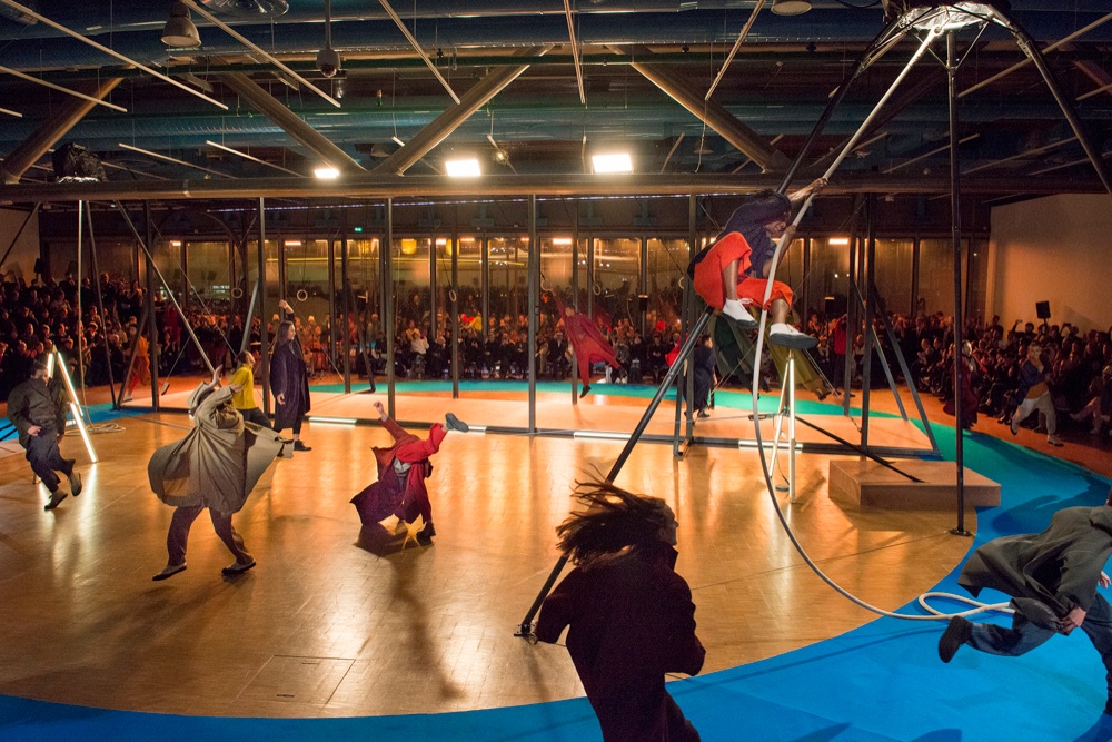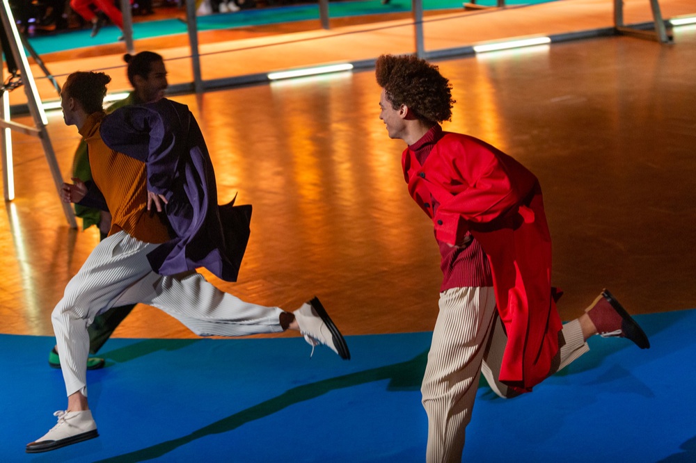 Oltre alla sfilata, allestita a Palais de Tokyo, Issey Miyake ha collaborato con il coreografo Daniel Erzalow per la prima presentazione live di Homme Plissè portando in scena come una performannce atletica in cui gli abiti fluidi accompagnavano i gesti dei corpi in movimento.