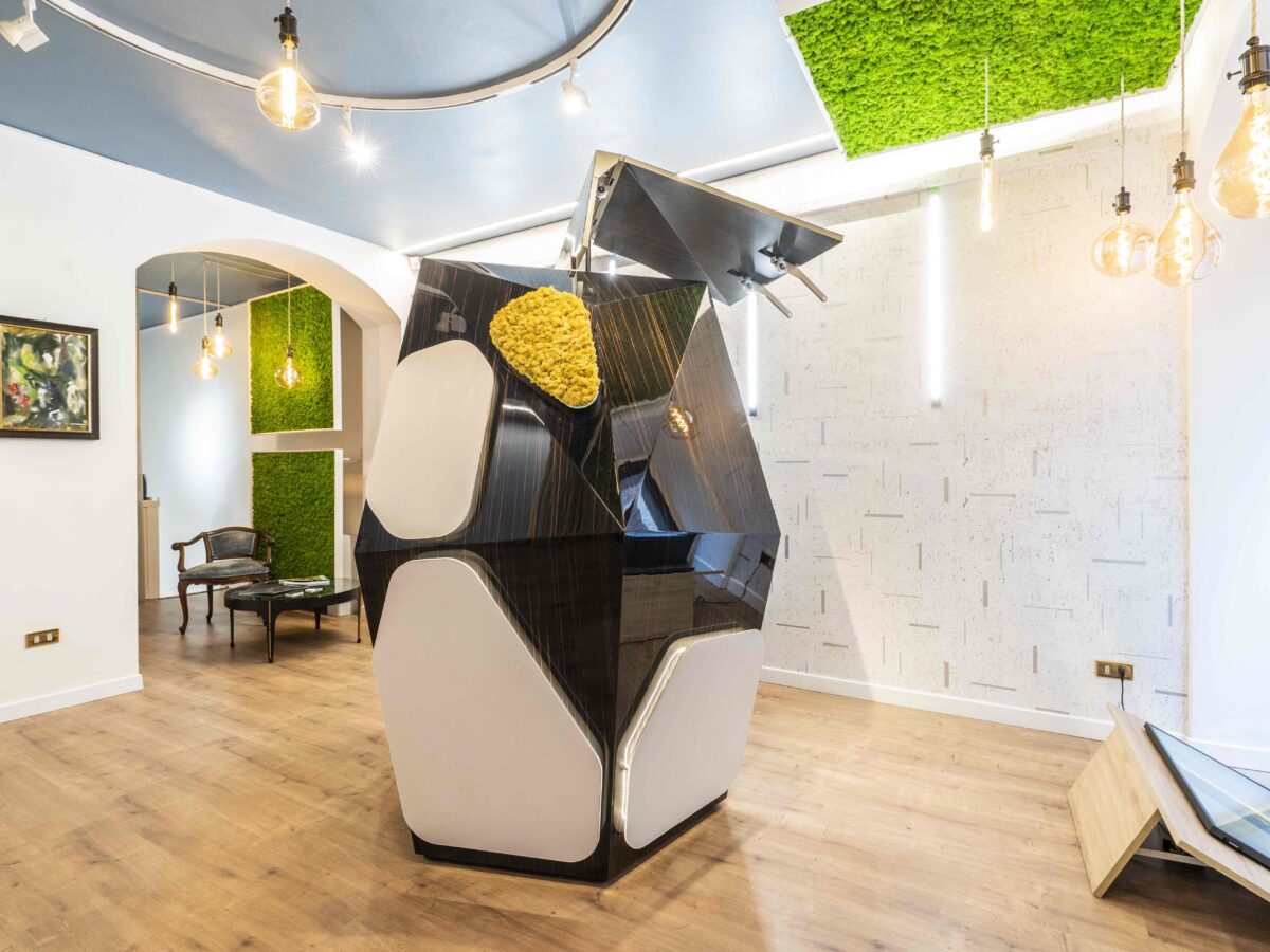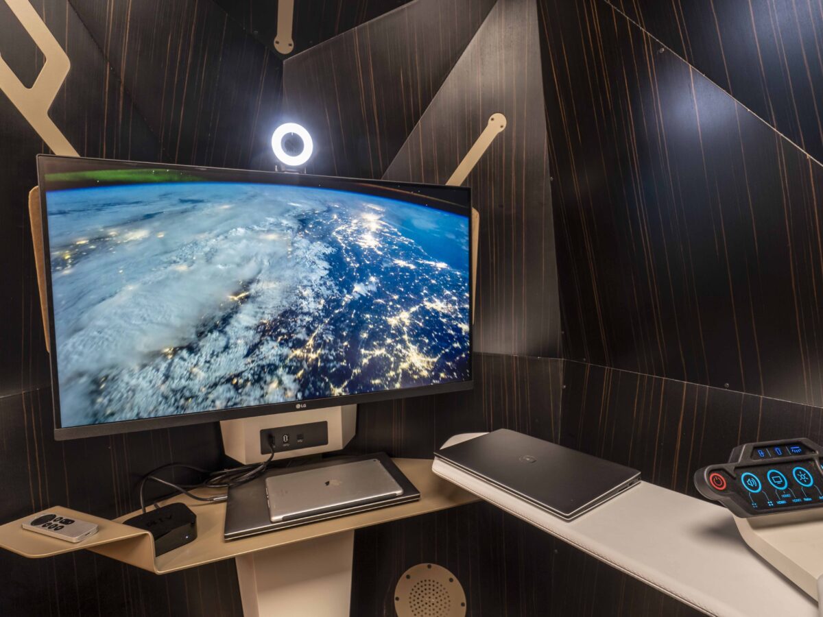 Pianeta è realizzato con materiali naturali: la struttura è in base lignea, con finiture variabili tra legni, metalli, materiali lapidei e pure del muschio, per farne una fascia ancora più green. Dall’esterno Pianeta ha forme che ricordano una scultura, con linee pulite ed essenziali. All’interno, lo spazio è un microcosmo d 2,5 metri quadrati (non poco: alto 1,75 metri, profondo 1,3 metri, peso tra i 120 e i 150 kg) con una poltrona ergonomica e punti di appoggio per i propri dispositivi e funzioni comandabili da uno schermo touch, una dolby webcam (per le riunioni), sistema di ricarica wireless per smartphone e di diffusione della musica più amata. Velluti e pelle rivestono l’ambiente interno che dispone di un sistema di purificazione dell’aria (con fotocatalisi) attivato da un sensore che monitora la qualità dell’aria. Pianeta parte da 29.200 euro nella configurazione base per arrivare a 37 mila nell’edizione luxury con finiture in ebano.