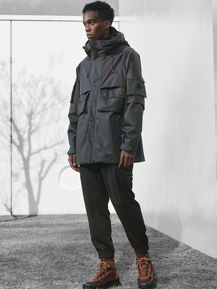 I colori sono caldi, autunnali. La palette è del legno, il foliage sfumato delle foglie, le tonalità delle spezie, come il cardamomo, o l’arancio della zucca si declinano su nylon tecnici, lane ecologiche e cotoni naturali. Le vestibilità sono ampie e fluide, le silhouette morbide. I pantaloni tendono addirittura a forme quasi scampanate. Sono elasticizzati a sottolineare il comfort e sdrammatizzare cargo e doppie pinces.