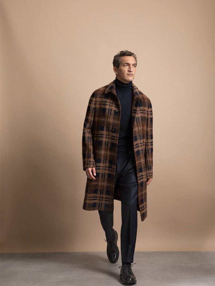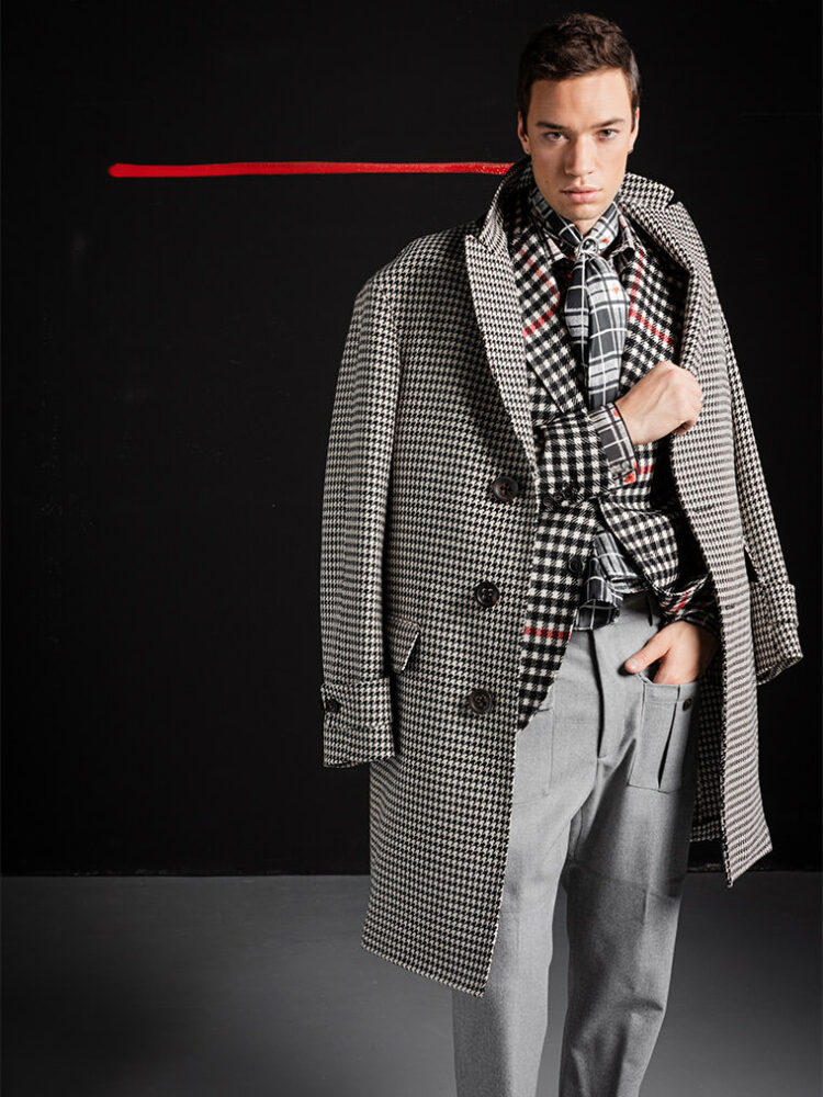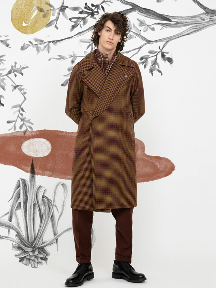 Protagonista della nuova collazione di Manuel Ritz è la ricerca nelle lavorazioni, che spinge l’acceleratore sul tinto in capo. I cappotti sono realizzati in lana tinta, riproponendo una palette rigorosa che va dal marrone bruciato al mattone, dal verde militare al navy. Non mancano le texture della tradizione, come principe di galles, overcheck, flanella e pied de poule che fanno da grande richiamo alla tradizione.