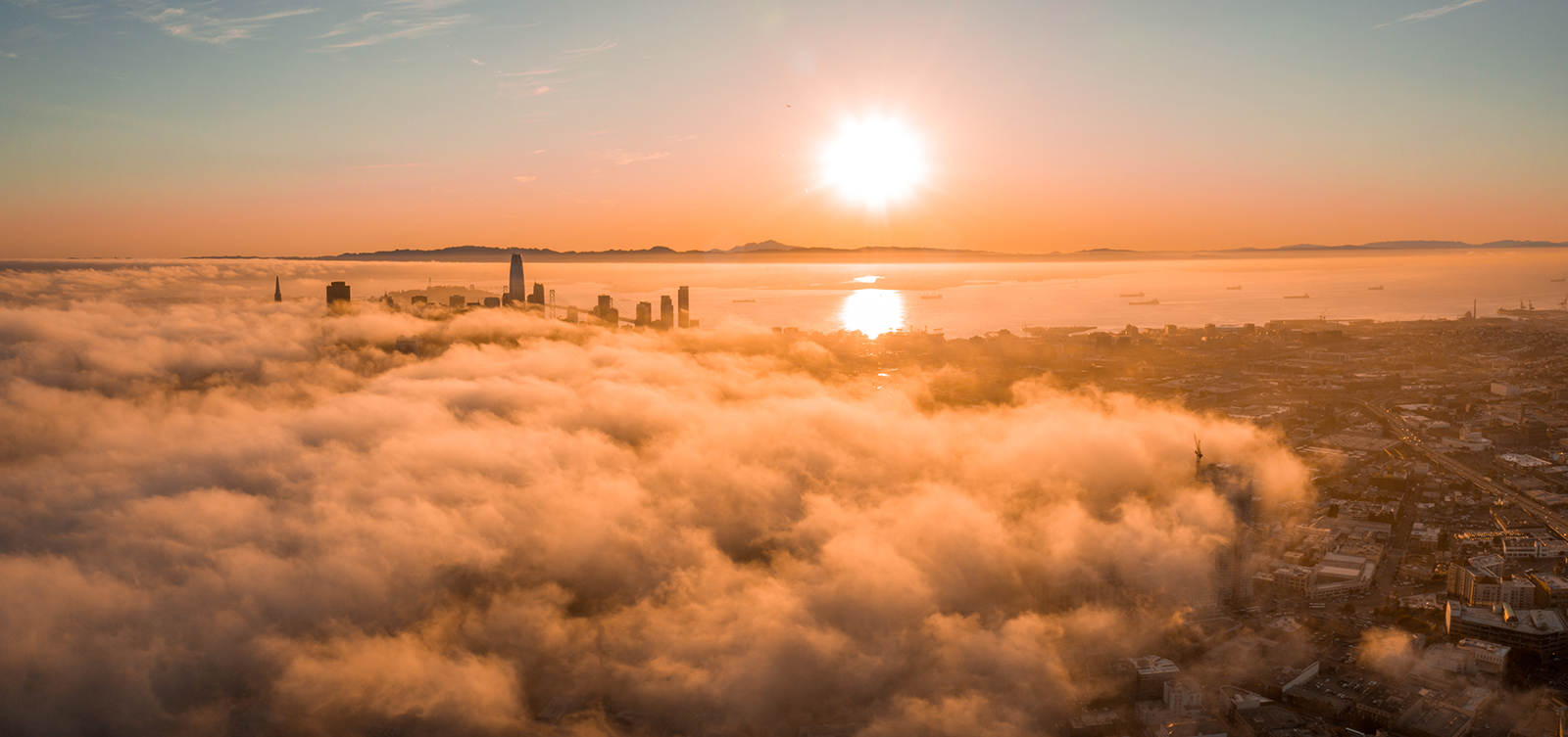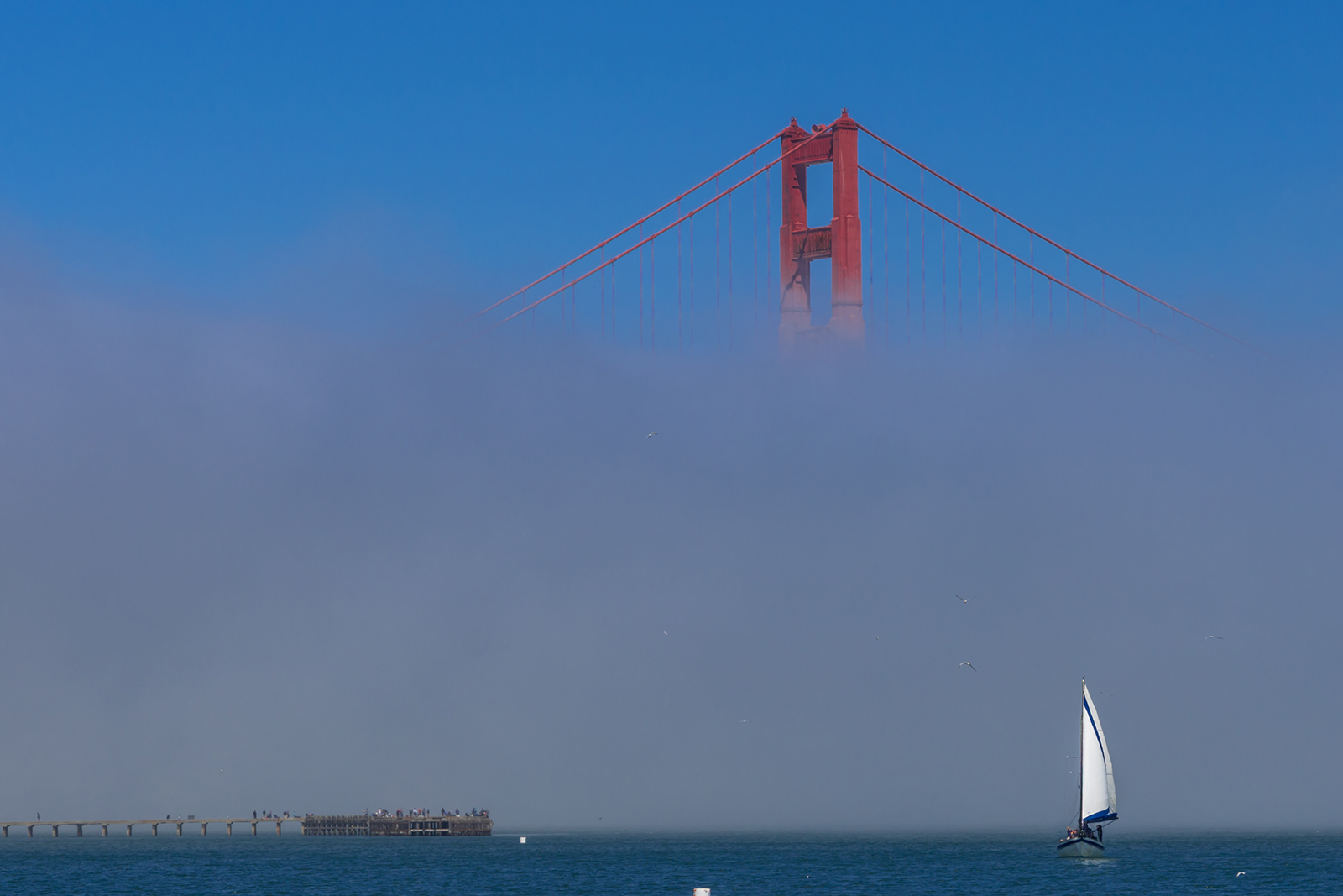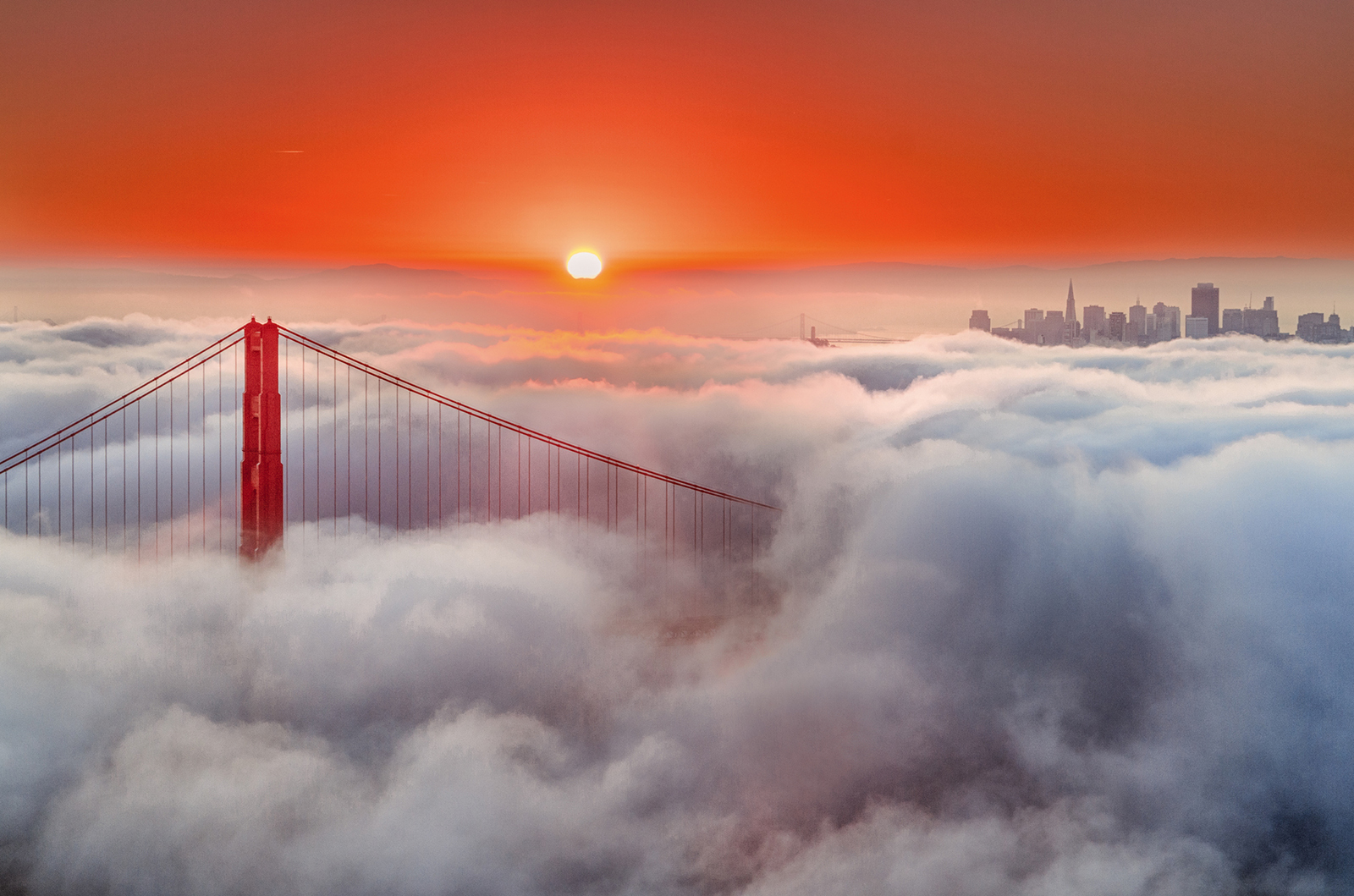 Sebbene la nebbia si veda sporadicamente per tutto l’anno, in estate siete certi di fare il suo incontro, perché le temperature più elevate dell’entroterra si scontrano con quelle più freddo dell’oceano Pacifico, provocando un aumento di questo fenomeno. Questo sbalzo di alta e bassa pressione spinge la nebbia attraverso il ponte Golden Gate Bridge, che si dice sia stato appunto dipinto di questo colore rosso per essere più visibile, nella baia e sulla città. Non copre mai quasi completamente gli edifici della città ed è più fitta, invece, presso la zona Marin Headlands, dietro il Golden Gate Bridge, di una bellezza naturalistica spettacolare.