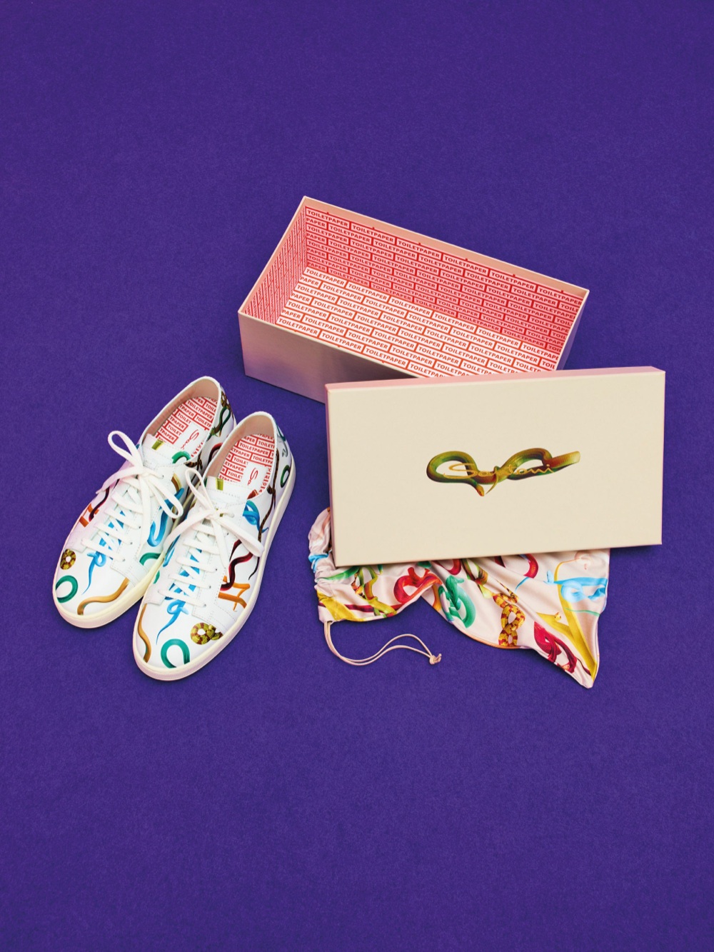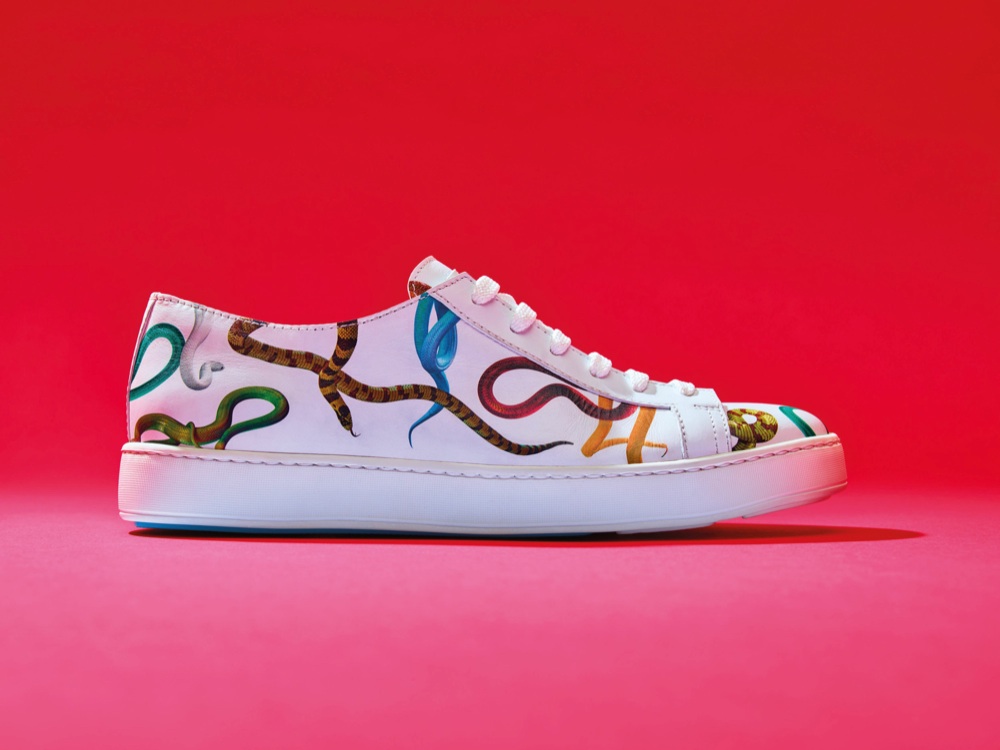 Come quella di Santoni che con Toilet Paper dà vita ad una limited edition dallo spirito colorato ed iconoclasta. La sneaker icona di Santoni, pulita ed essenziale, diventa tela bianca su cui imprimere le grafiche pop e colorate che contraddistinguono Toilet Paper. Ed ecco che sulla morbida pelle bianca appaiono, aggrovigliati e colorati, i serpenti dell’Eden, uno dei temi ricorrenti del duo Cattelan-Ferrari. Il design sempre innovativo di Santoni si unisce alla provocazione e l’irriverenza di Toilet Paper, creando un prodotto ironico e sorprendente che unisce il mondo dell’arte e quello della moda con un’immagine vibrante e non convenzionale. La capsule collection sarà in vendita in esclusiva nel sito Toilet Paper e, a seguire, in quello Santoni.
