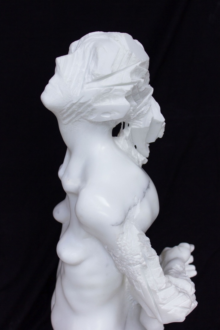 Sono Alex Rane, scultore nato a New York nel 1986 e ora di casa a Carrara e Tomas Watson, pittore nato nel 1971 in Inghilterra, vive ad Atene. La loro filosofia è quella di convogliare l’attenzione del pubblico su quella parte specifica della narrazione che vogliono veramente evidenziare. E lo fanno come se avsssero a disposizione uno zoom, o un ingrandimento per vedere da vicino la lavorazione finissima di ogni particolare, lasciando il resto semplicemente abbozzato. L’interesse cioè riguarda il frammento di un’opera, ed è in quel momento, dopo che l’occhio si è concentrato su questi punti di forza, che gli artisti chiedono all’osservatore di completare la storia…di riempire gli spazi vuoti (filling in the blanks, appunto).
