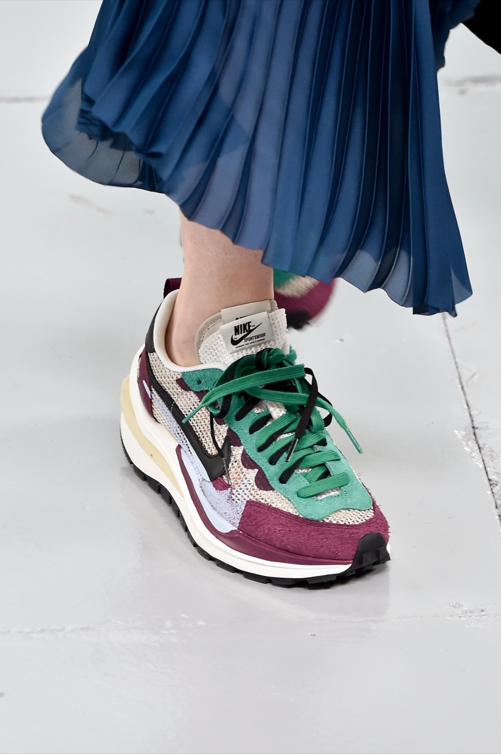 Dopo il clamoroso successo nella stagione precedente con le LDWaffle, Sacai insieme a Nike fa sfilare la Vapor Waffle. L’idea di base è praticamente la stessa, una sneakers che s’ispira al mood giocoso e alternativo che caratterizza il brand giapponese. Le tomaie sono una perfetta mescolanza di colori e materiali, montate alternate con la suola creando così un effetto 3D e aereodinamico.