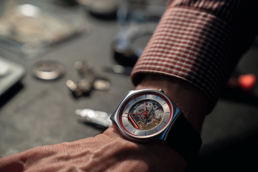 L’orologio dedicato a Q, in edizione limitata, è stato creato con Suttirat Anne Larlarb, la costumista di No Time To Die. Lo SKIN Irony in acciaio inossidabile, sintesi perfetta della personalità e dello stile di Q, riflette due caratteristiche in lui coesistenti, tradizione e innovazione futuristica. Cinturino in pelle stampata a motivo tartan, bordi rossi al vivo e quadrante in acciaio spazzolato che lascia vedere il complesso meccanismo: il perfetto punto d’incontro tra Swatch e Q a ore 6.
