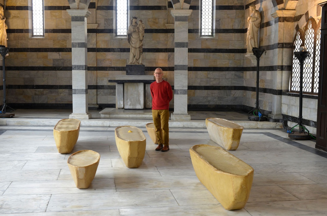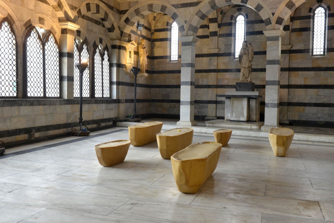 L’opera, poi: sei barche in cera naturale, profumatissima, prendono posto sul pavimento della chiesa. E la reliquia della spina, per eccezionale concessione di S.E Mons. Giovanni Benotto, Arcivescovo di Pisa, dal 2 all’8 aprile 2017, è posta sopra l’altare. Perché il viaggio compiuto da quelle barche è associato alla sofferenza. Al dolore, alla perdita. Ecco perché la cera d’api, uno dei materiali tipici di Laib che sceglie sempre elementi di origine vegetale o animale – latte, polline, riso, cera d’api – coinvolti nei processi dell’alimentazione e della sopravvivenza, effimeri e degradabili ma al tempo stesso essenziali per la vita.