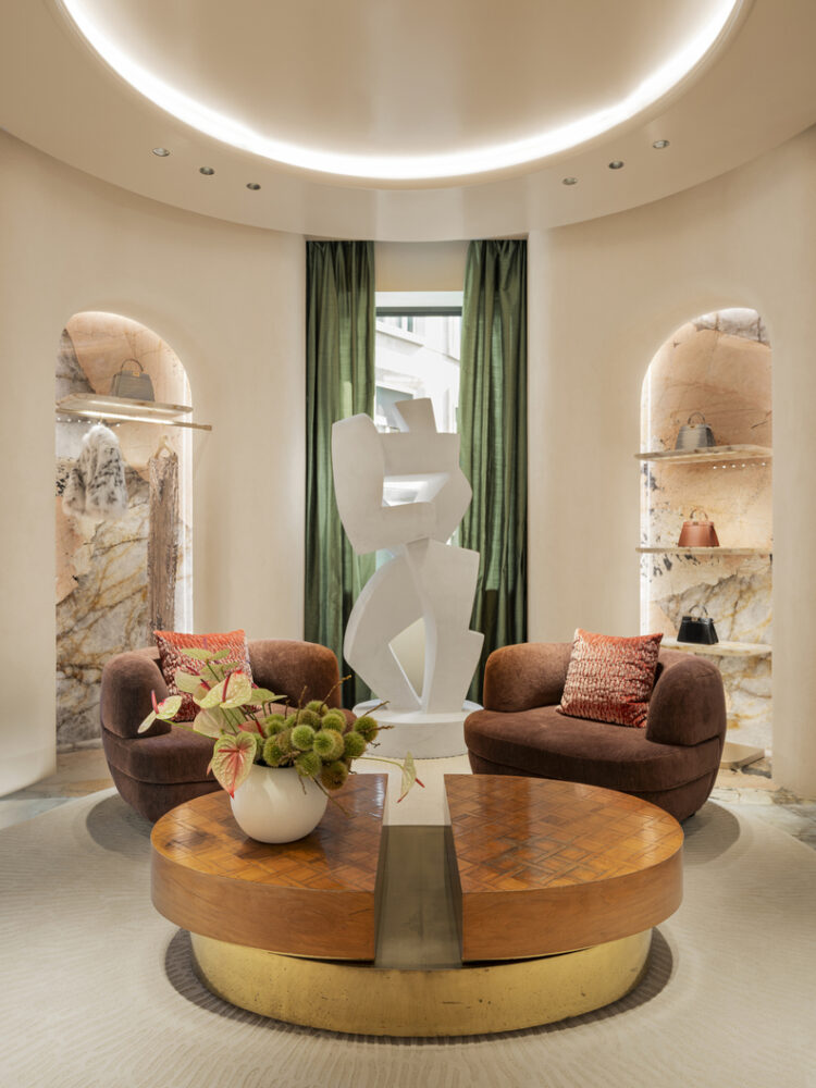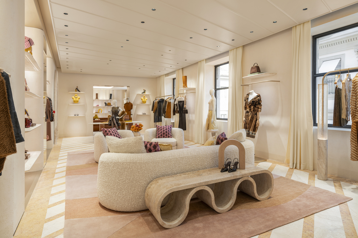Ogni piano è pensato come una narrazione. Al piano terra, dedicato agli accessori femminili, domina la luce calda e i toni cremosi del marmo, interrotti da opere d’arte site-specific come la scultura ceramica di Anton Alvarez, realizzata in esclusiva per Fendi. È una boutique che si attraversa come una galleria d’arte, dove ogni spazio invita a rallentare e osservare.