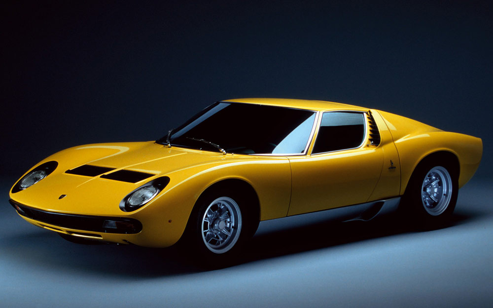 Miura - Primo vero grande successo del marchio del toro, datato 1966. Con il suo V12 da 3,9 litri, progettato da Giotto Bizzarrini, e un design innovativo firmato Bertone, la Miura conquistò il cuore di tanti appassionati. Al suo debutto era l'auto stradale più veloce del mondo, con una velocità massima di 280 km/h. Rimase in produzione fino al 1973 e tutt’ora è tra i modelli più ricercati dai collezionisti. (Credits: Lamborghini)