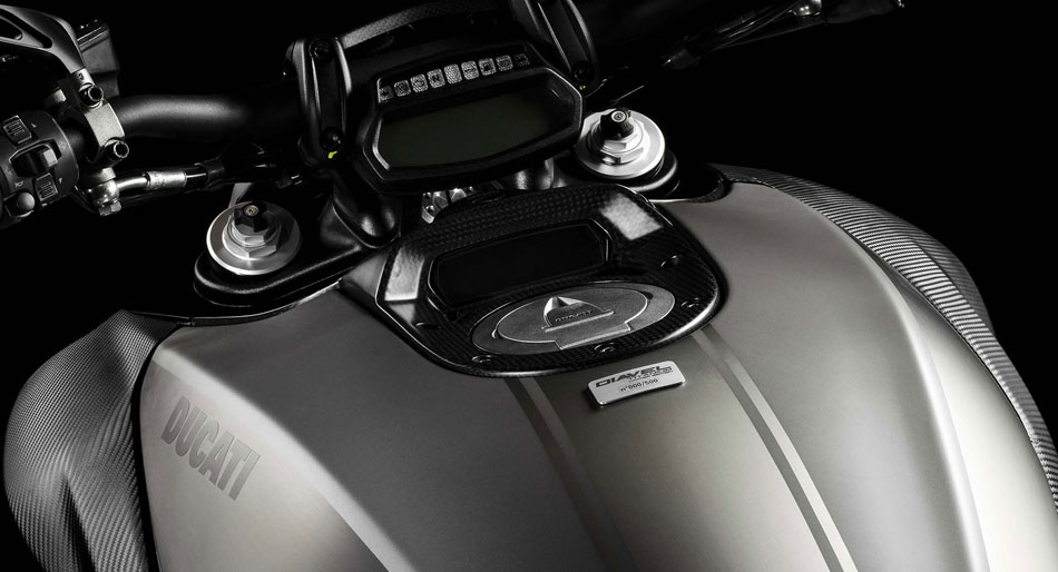 Come si intuisce dal nome, è stato scelto il titanio come materiale principale, che con la sua resistenza e leggerezza è tra i più pregiati metalli utilizzati nel mondo dei motori. In questa Diavel speciale lo troviamo sulle grandi cover del serbatoio e del fanale anteriore. Abbinato alla fibra di carbonio, il titanio è presente anche sul coprisella passeggero, esteticamente abbellito da trattamenti di nastratura e satinatura chimica, capaci di regalare sfumature cromatiche sui toni del nero e del grigio molto suggestive. Il carbonio è invece il principe delle prese d’aria, del cupolino e dei parafanghi, oltre che di altri dettagli estetici. L’ampio utilizzo di questi due materiali consente un notevole alleggerimento della Diavel, ottimizzando le prestazioni del possente motore Testastretta DS 11° da 162 Cv.