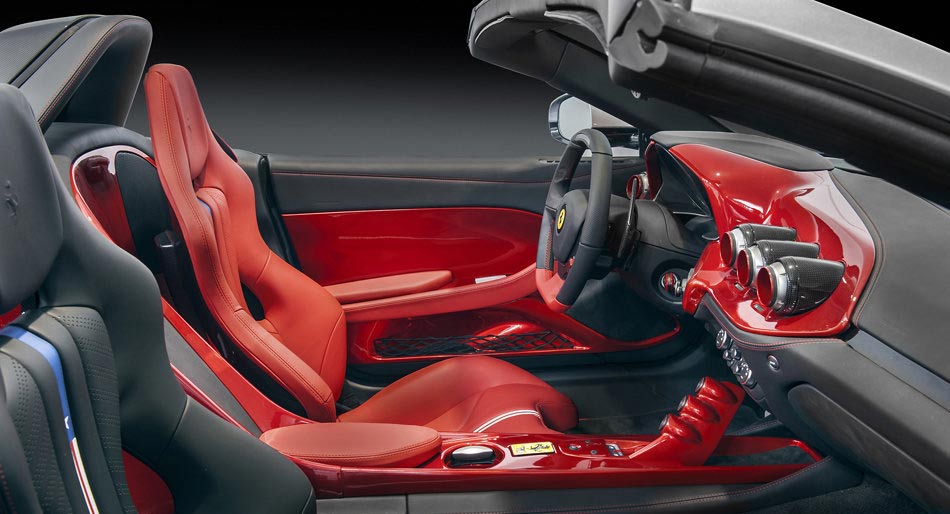 I due sedili sono una sorta di faccia a faccia tra passato e presente. Il posto di guida richiama le corse di oggi, con il suo rosso acceso, mentre la seduta del passeggero è ispirata al nero dei vecchi sedili delle prime Ferrari da pista.