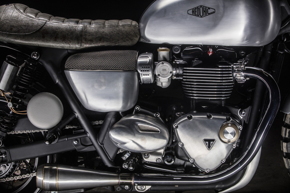 Lo stesso hedonicismo è applicato alle special a due ruote, costruite intorno al bicilindrico parallelo Triumph raffreddato ad aria e omologato Euro 4. Il “numero zero” si chiama Neo, declinato in stile scrambler dal costruttore francese Ludovic Lazareth per costituire un’ideale alternativa alla Storm in una soleggiata giornata californiana. Il secondo modello è stato – legittimamente – battezzato Amazing e con i suoi scarichi alti, le finiture superlative e l’estetica immortale delle café racer, è forse quella che rappresenta meglio lo stile Hedonic. A proposito di scarichi, una curiosità: sull’estremità dello scappamento montano una turbina esclusiva che dona un suono inimitabile alle auto e alle motociclette uscite dall’atelier di Serge Heitz.